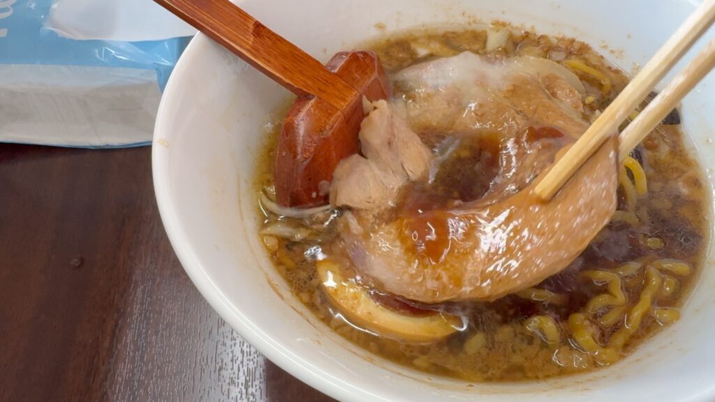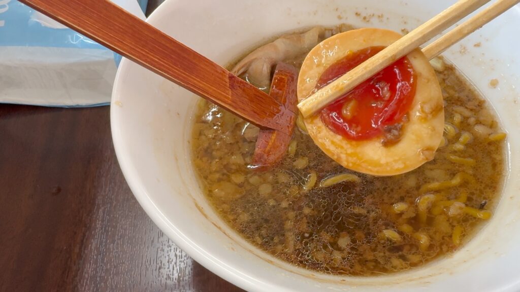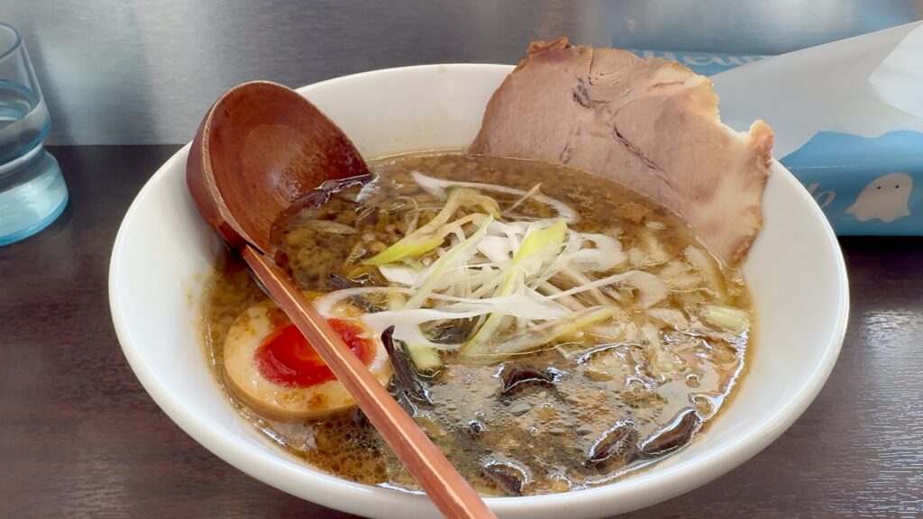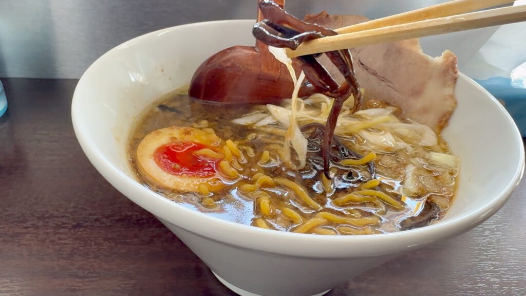 具はきくらげ、ネギ、玉ねぎ、味玉、チャーシュー、玉ねぎのシャキシャキとした食感がアクセントになっています。