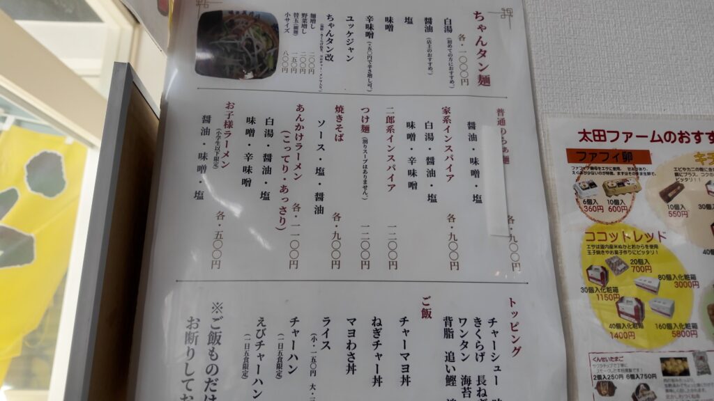 ラーメンはちゃんタン麺をはじめ、家系インスパイアや二郎系インスパイアなど気になるメニューが沢山あります。