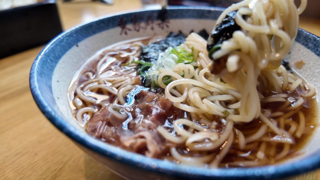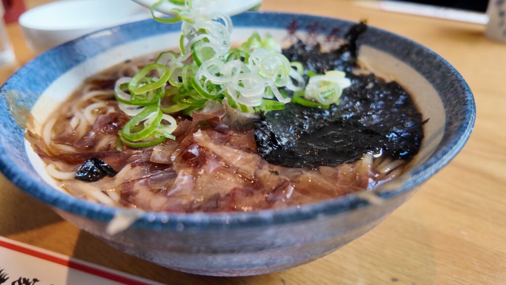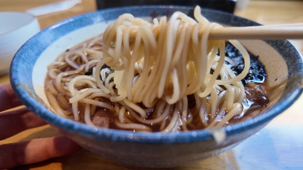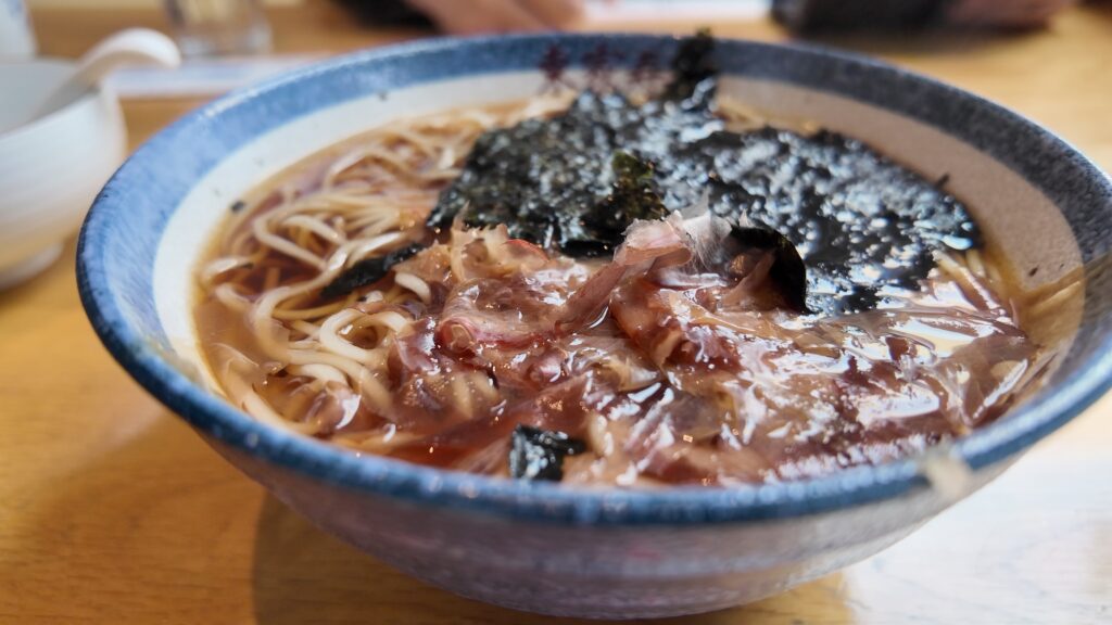 つゆがしっかりと絡んだお蕎麦、食べていると海苔や鰹節も一緒に絡んできてそれがまた美味しいです。
