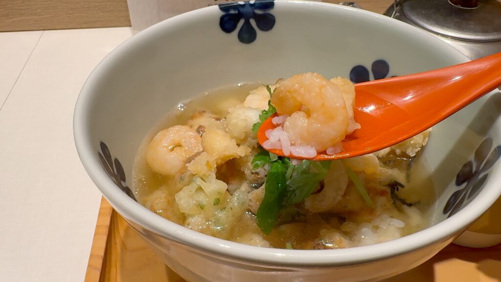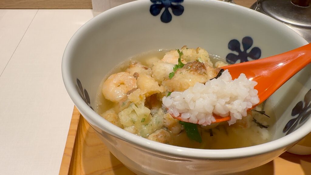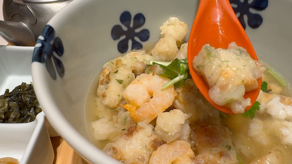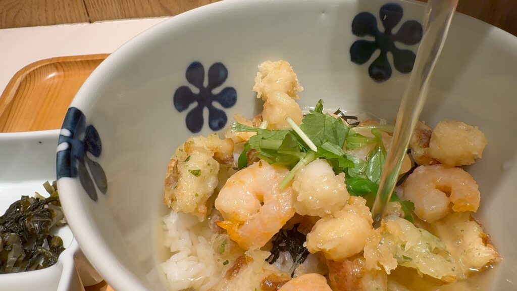 ご飯の上には海老や小柱、ちくわの磯辺揚げがのっていて、磯香りが良く、お出汁をかけてすぐはサクッとした食感も残っています。