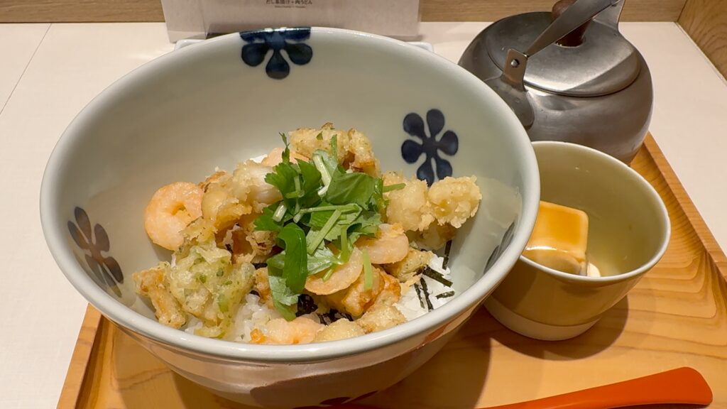 揚げたての天ぷら、このままいただいても美味しそうですが、贅沢にお出汁をかけていただいていきます。