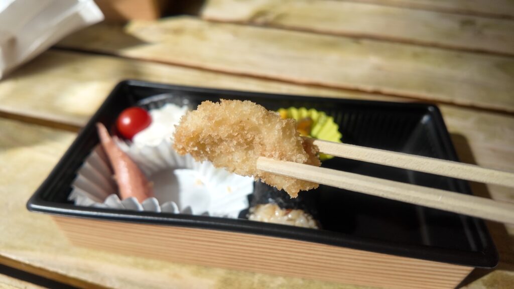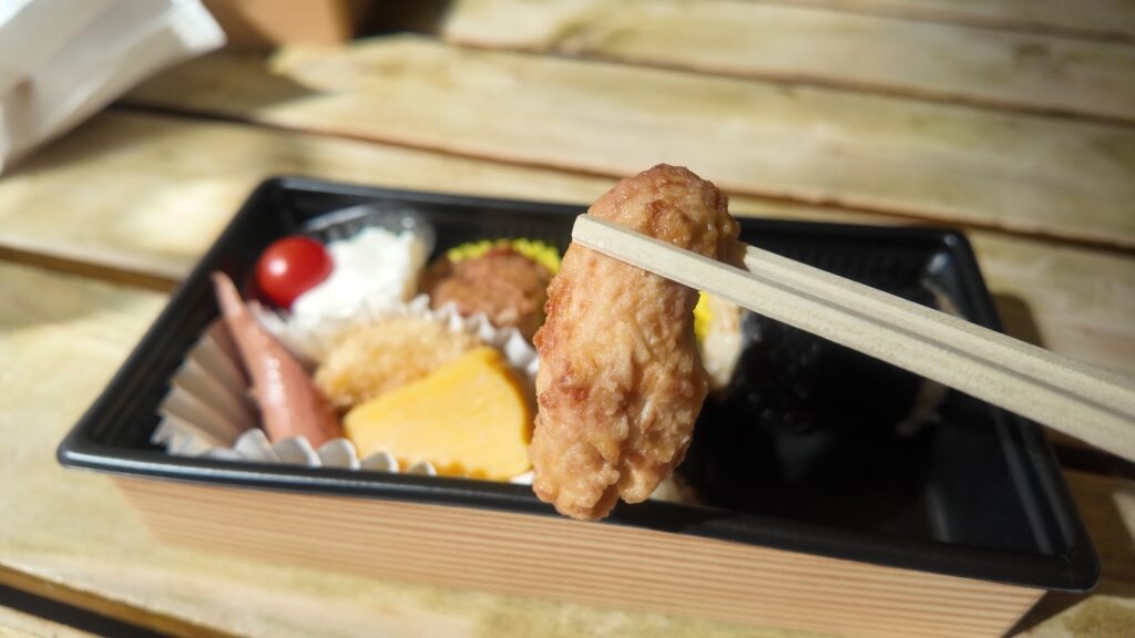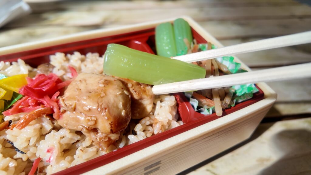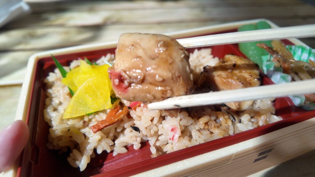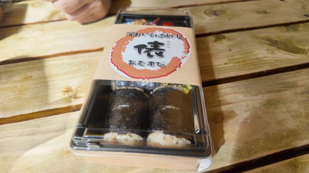 こちらはスカイラウンジさんが作られているお弁当でそばの実入りの俵おむすびはそばつゆで味付けがされています。