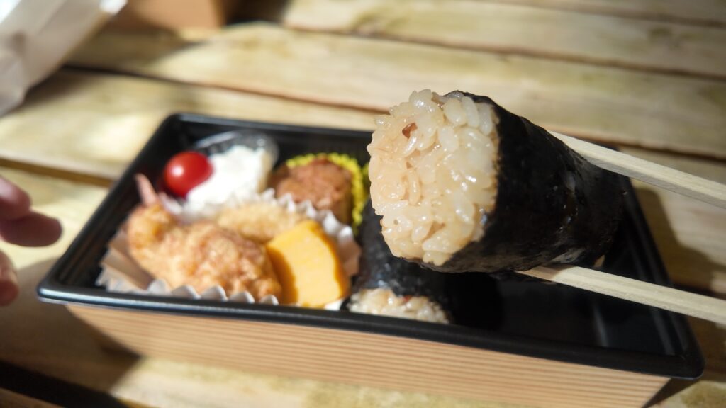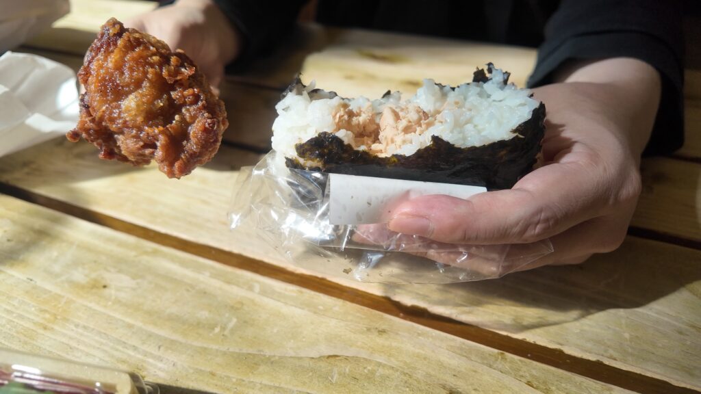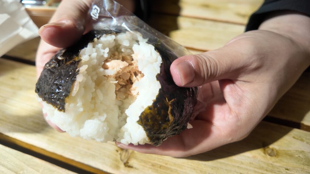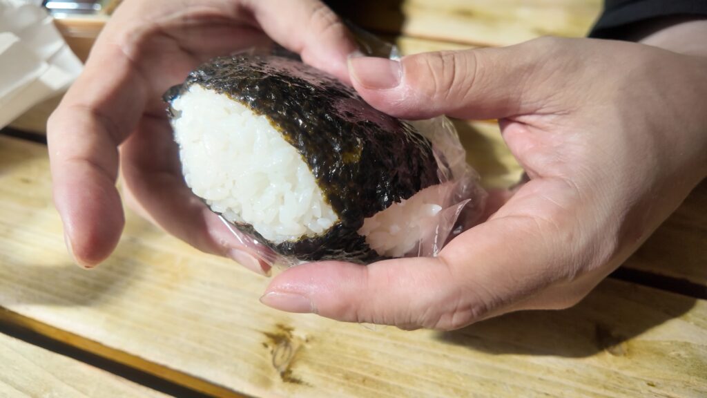 おにぎりはまだ温かく、開けると海苔の良い匂いがしてきました。