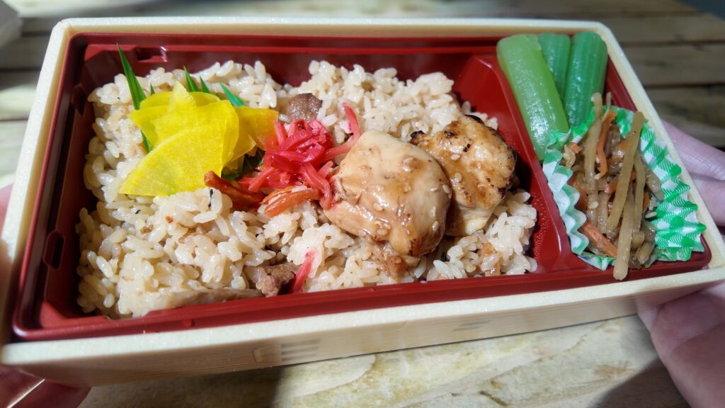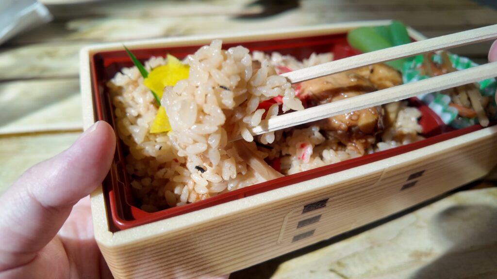 味の染みた混ぜご飯には鶏肉、にんじん、牛蒡、ひじきなどが入っています。