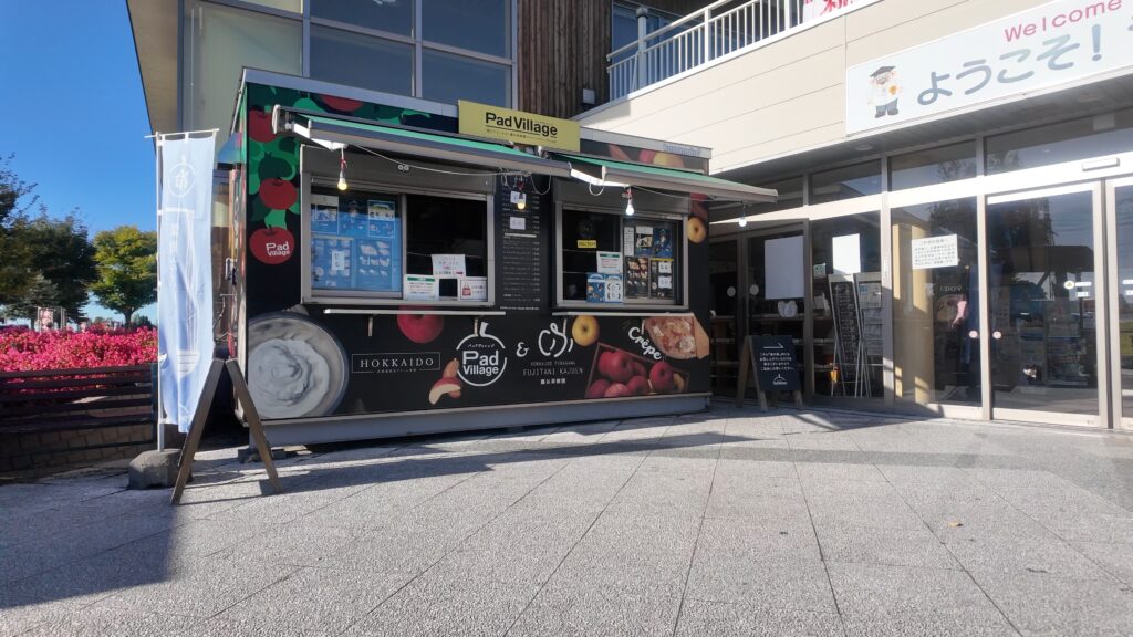 「藤谷果樹園」さんの自社農園のりんごを使用したクレープや深川の「多度志そば」をいただけるお店です。