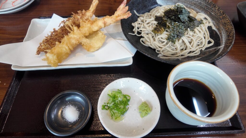 二種類のエビとイカの天ぷらの付いた冷たいお蕎麦の組み合わせです。