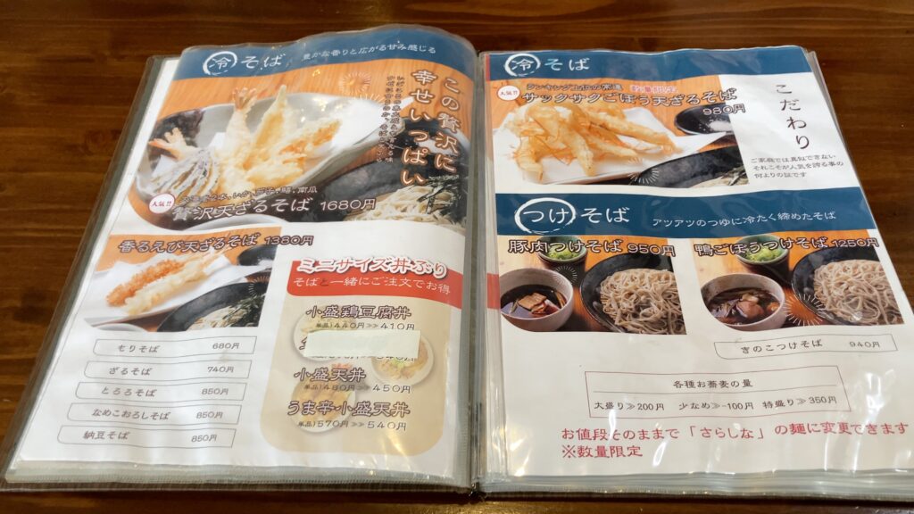 天ざるそばにつけそば、ごぼう天ざるそばやしみだす鴨南蛮そばなど魅力的なものばかりです。