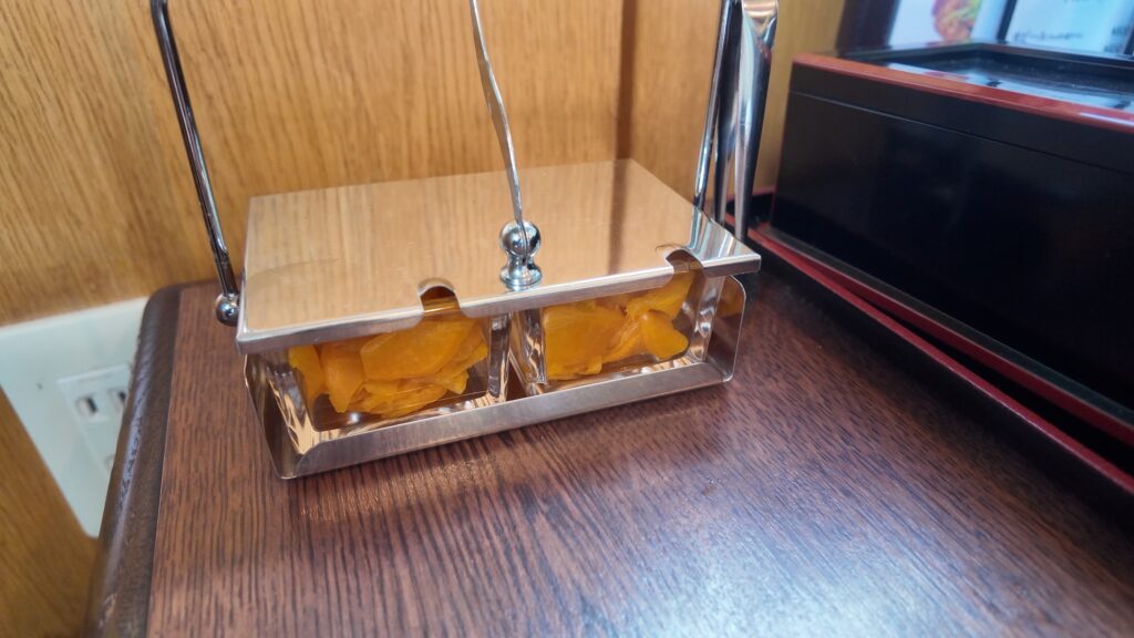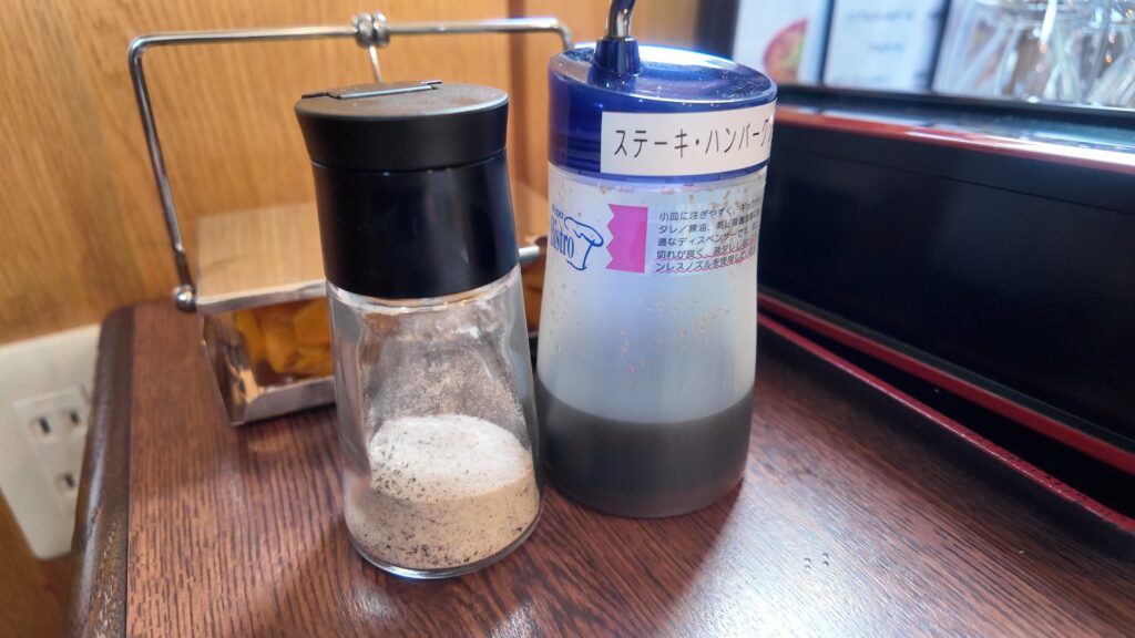 卓上にはステーキ・ハンバーグソースと塩胡椒、そしてお漬物がセットされていました。