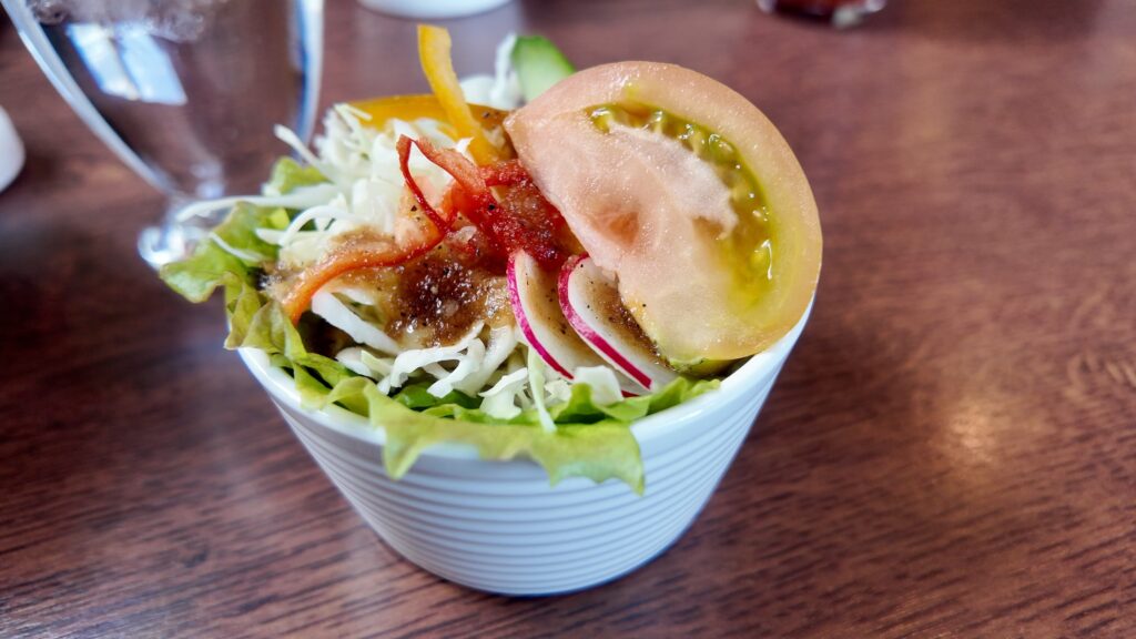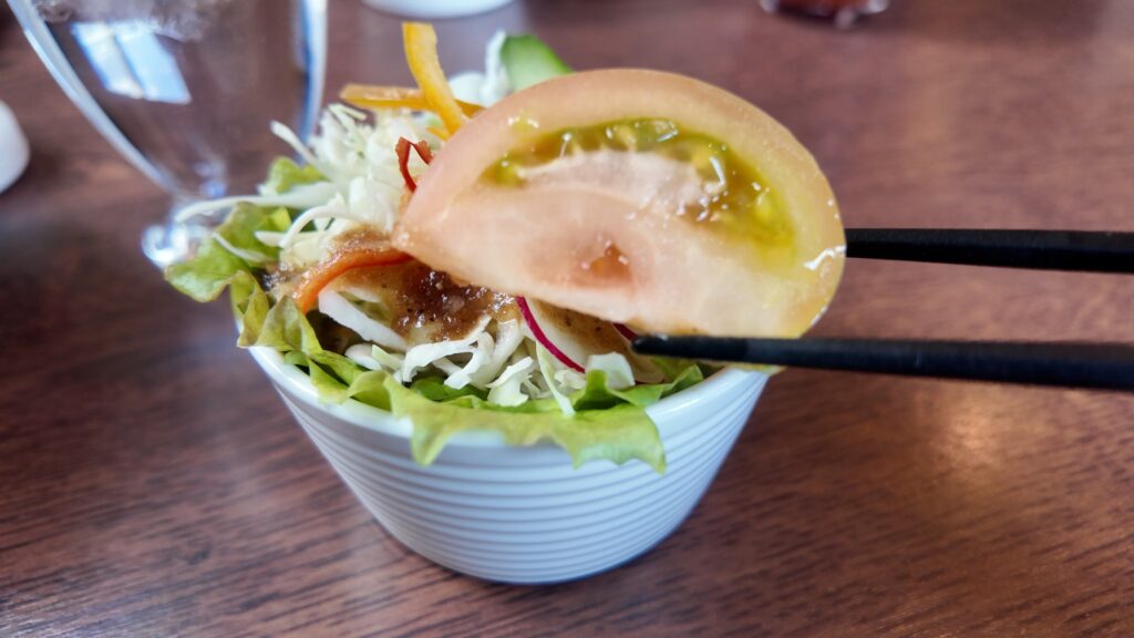 セットはこちらも同様にサラダ、ライス、お味噌汁付きです。
