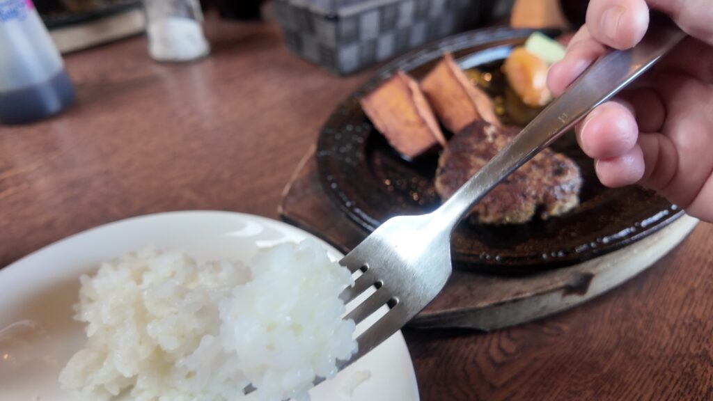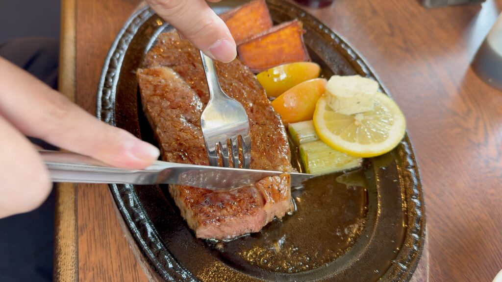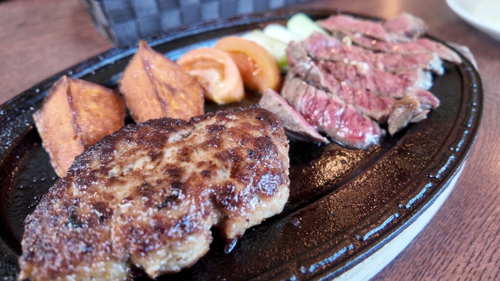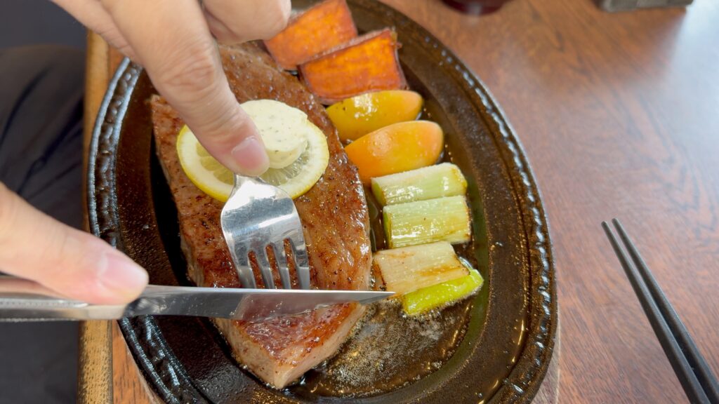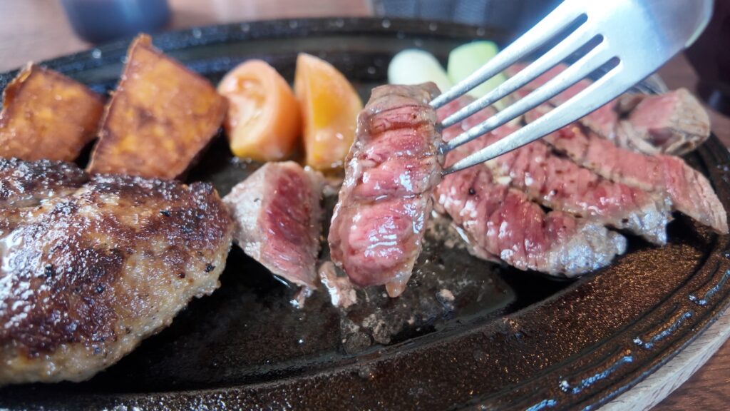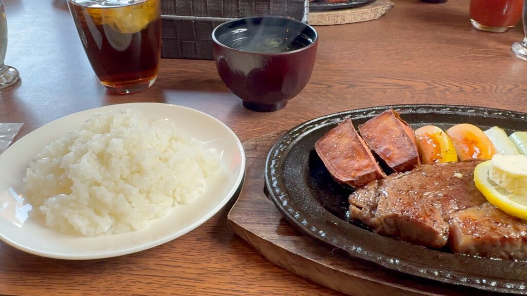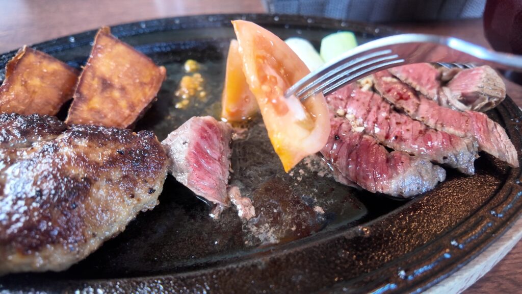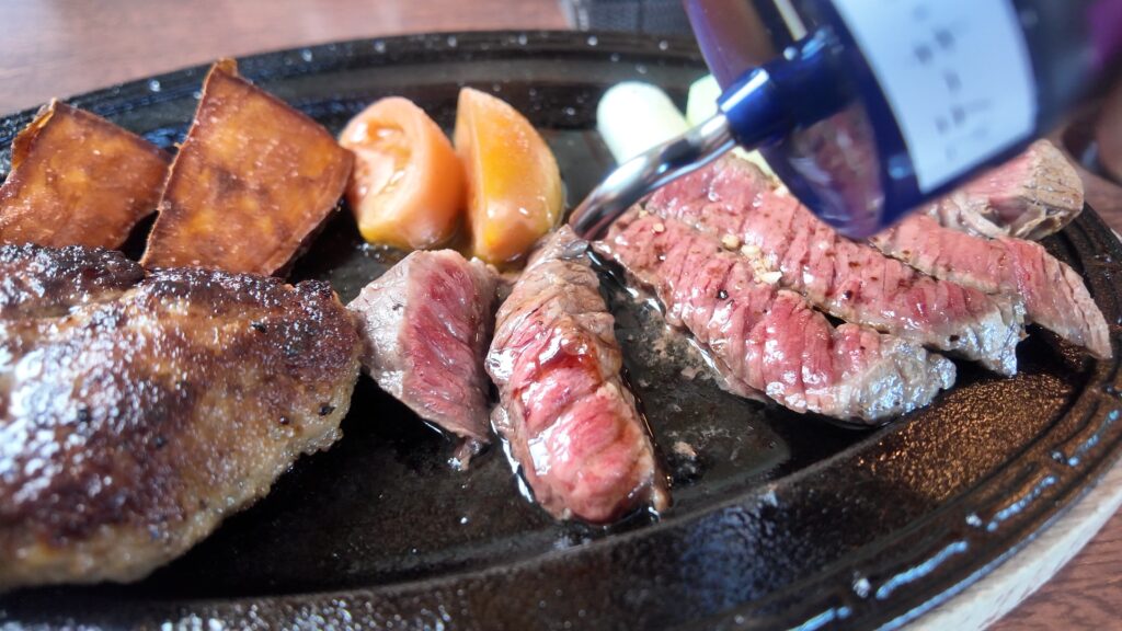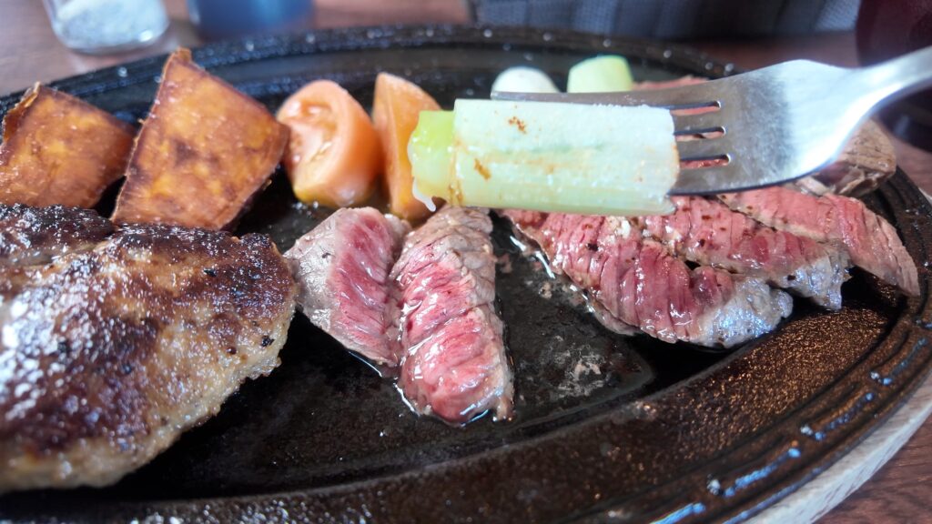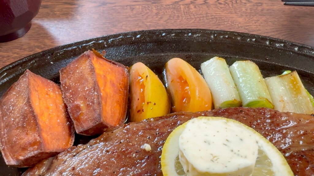 鉄板にのってジュージューと食欲を掻き立てられる音がしています。