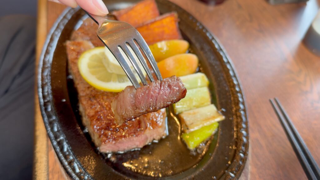 私も一口お裾分けしたところ、歯が無くても食べられそうなその柔らかさと重たさを感じない肉汁に驚きました。