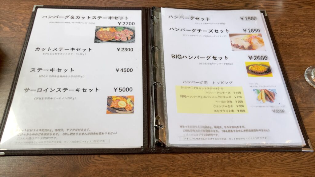 びらとり和牛のステーキやハンバーグをはじめとした、地元の特産品を使用したお食事がいただけるお店です。