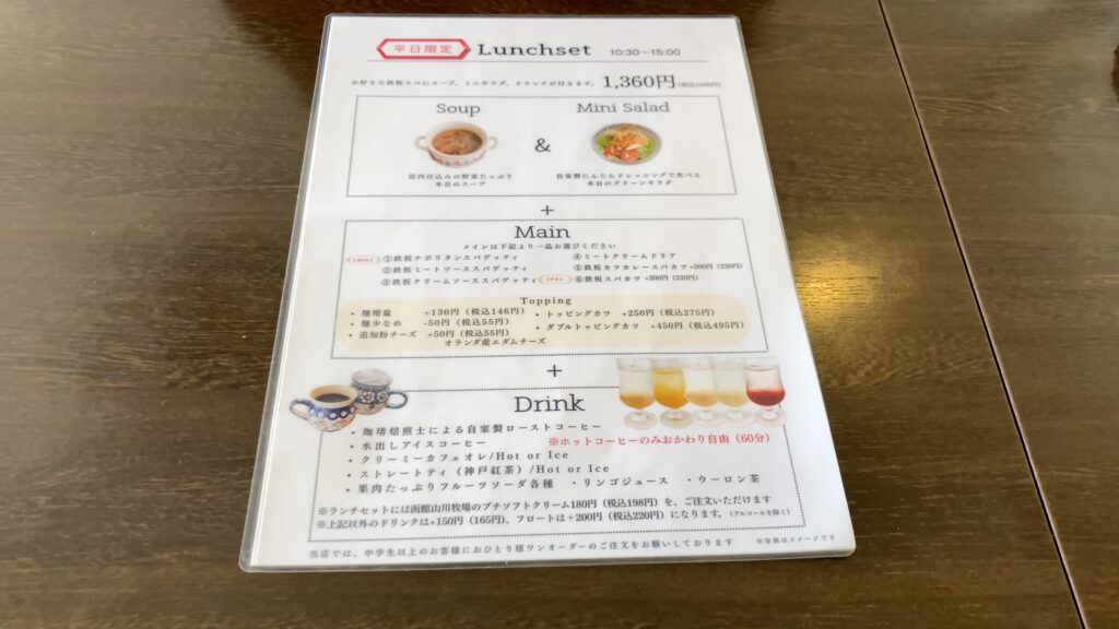 また、平日のランチタイムにはランチセットもあり、こちらは鉄板スパまたはドリアにスープとミニサラダ、ドリンク付きのようです。