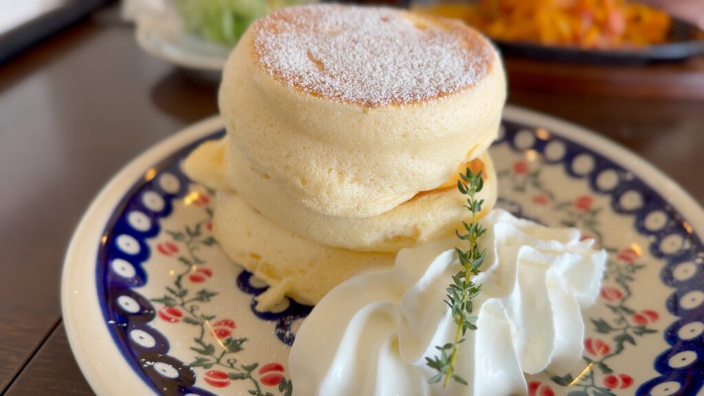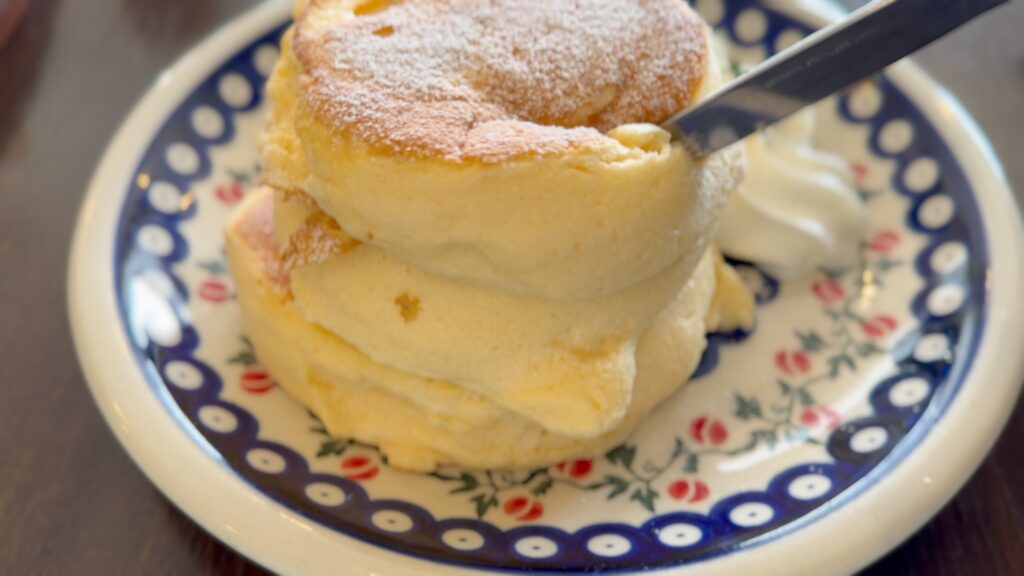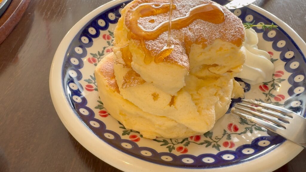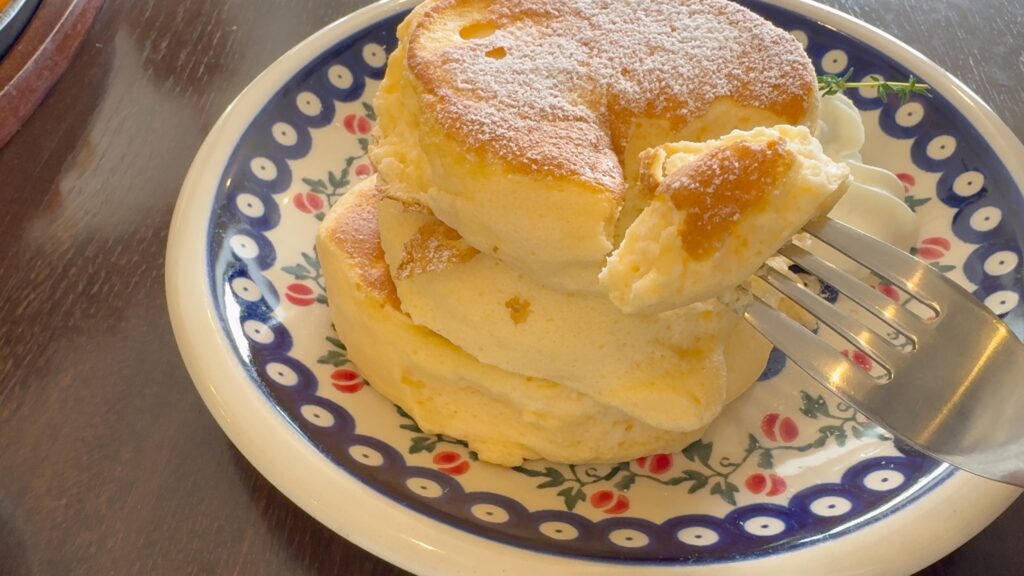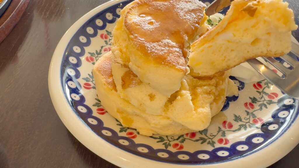 最初に見た時は大きいと思いましたが、口当たりが軽いので、三枚重ねでもぺろっと食べることができてしまいました。