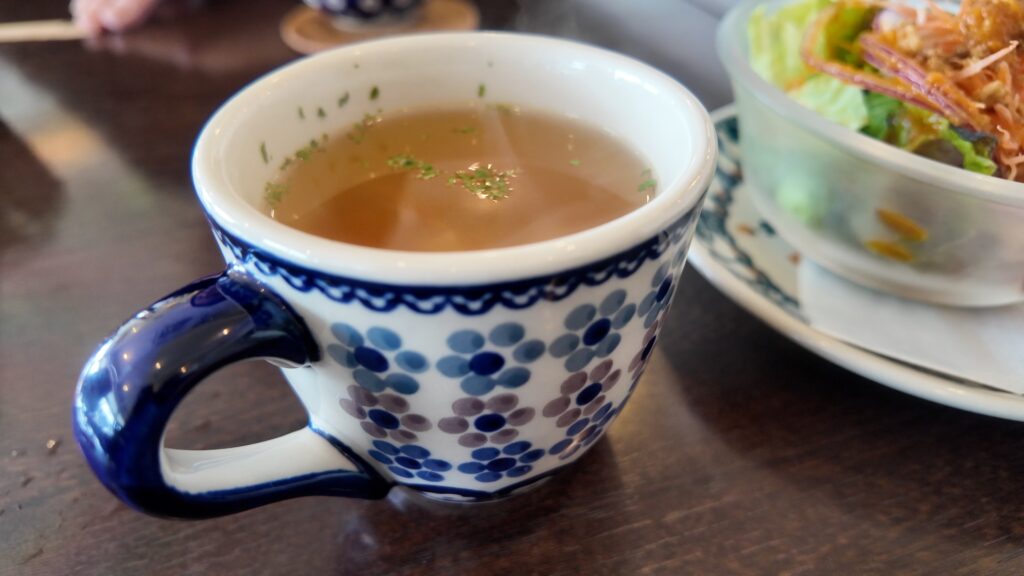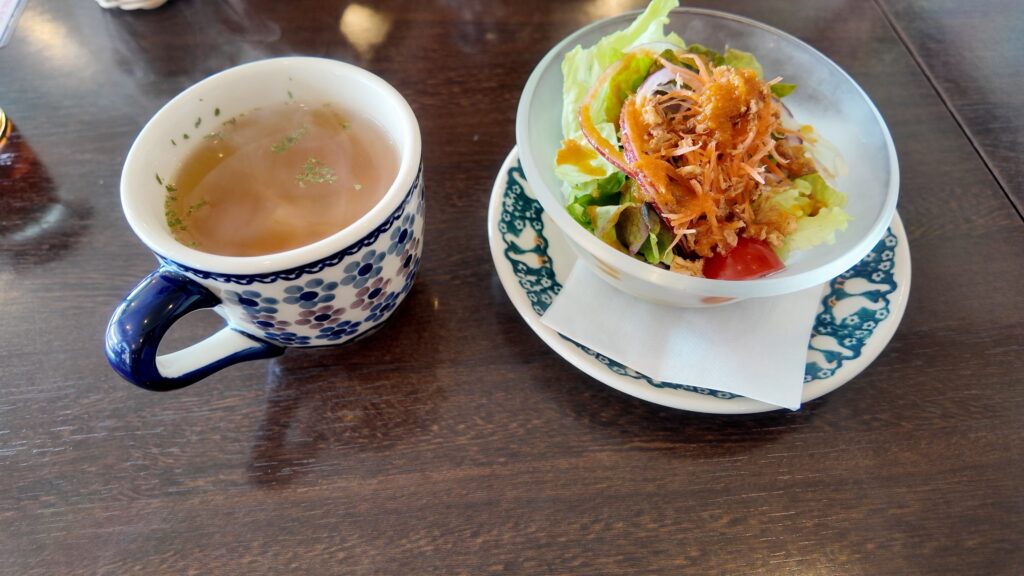 最初にスープとミニサラダが運ばれて来ました。