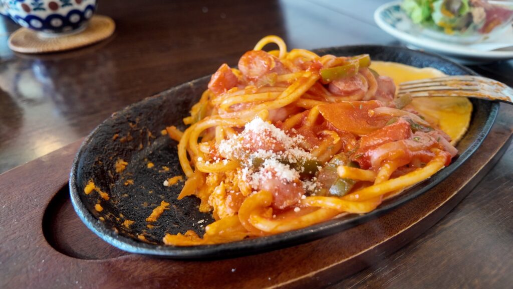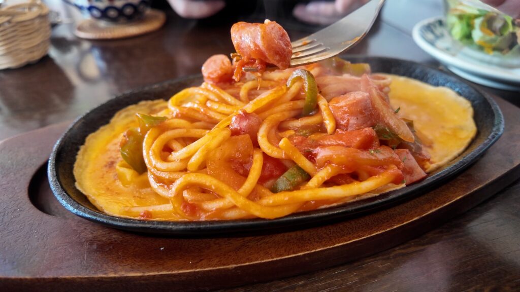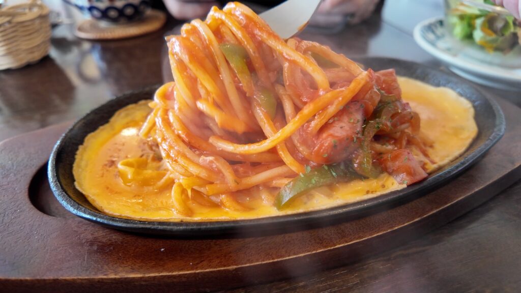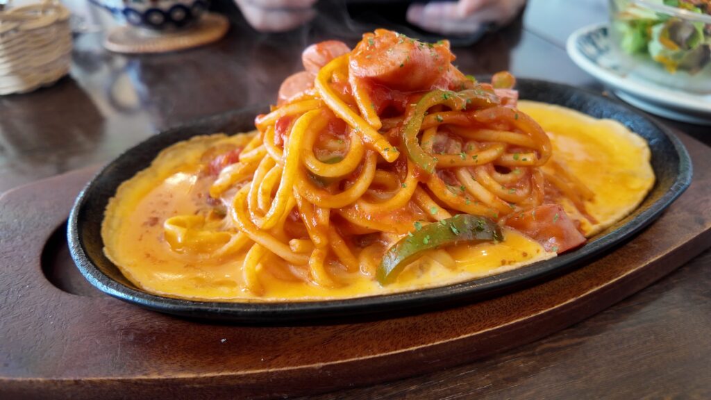 熱々の鉄板にのって提供され、ナポリタンの周りを卵が囲んでいます。