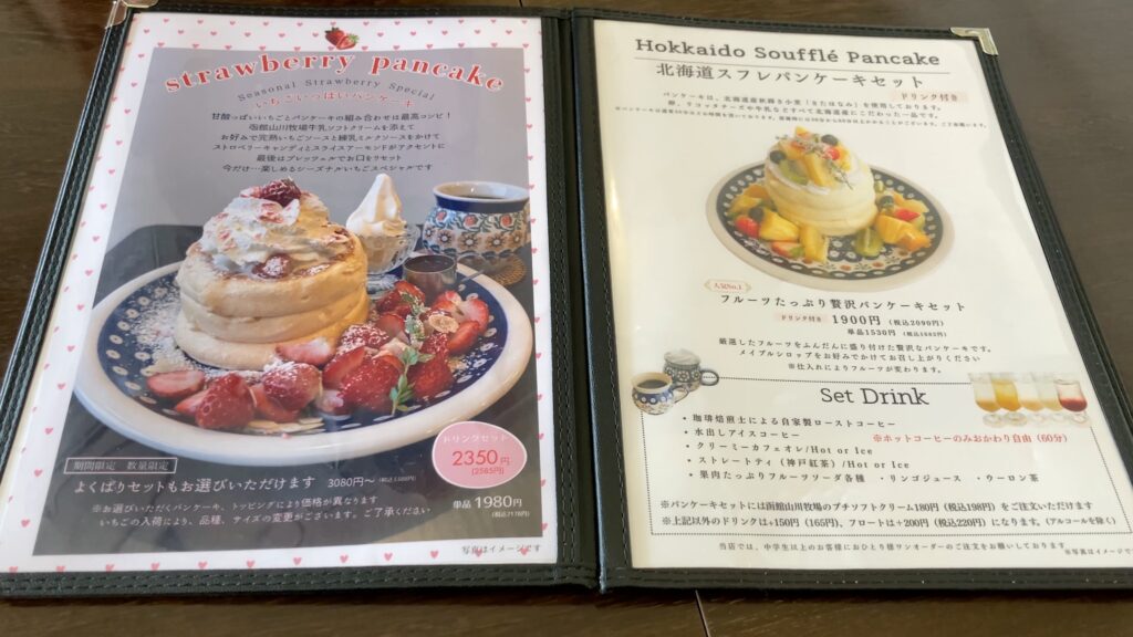 パンケーキはドリンクとのセットもあり、プレーンからチョコ、果物たっぷりのものなど種類があります。
