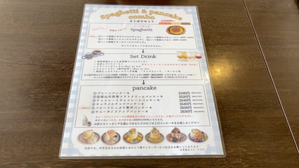 鉄板スパもパンケーキも食べたいという方にはハーフサイズの鉄板スパとパンケーキ、ドリンクの付いたよくばりセットもあります。