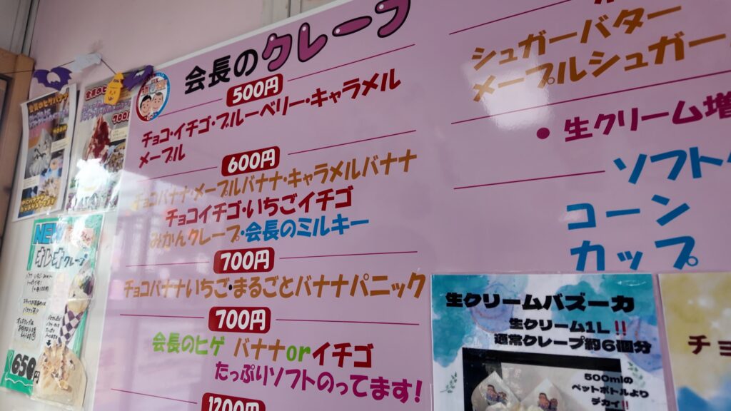 クレープはシンプルなものから生クリームが1ℓ使用された生クリームバズーカなどユニークなものもあります。