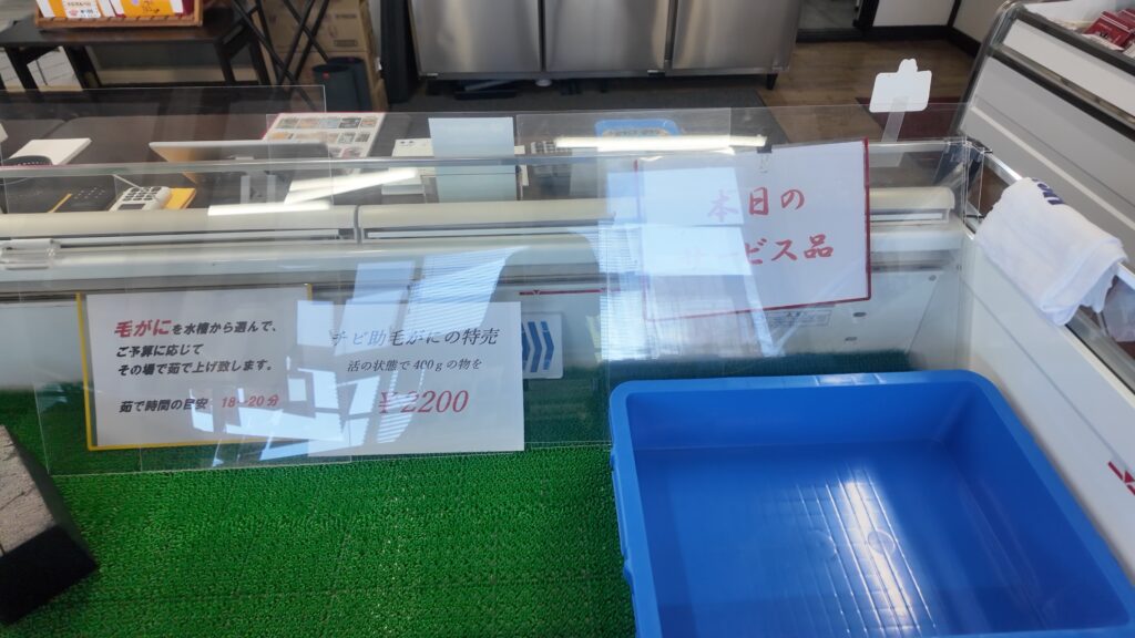店頭には本日のサービス品「チビ助毛蟹の特売」が書かれていました。