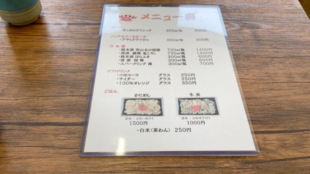食堂では茹でた蟹をいただくだけではなく、かにめしや牛丼などのメニューもあるのでお食事のみも可能です。