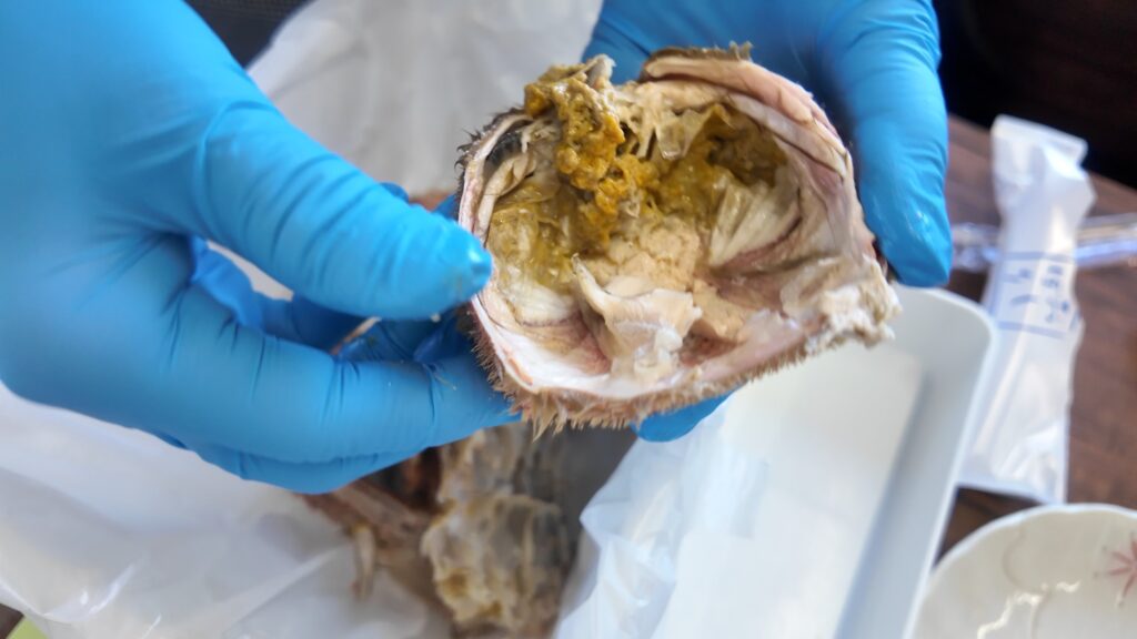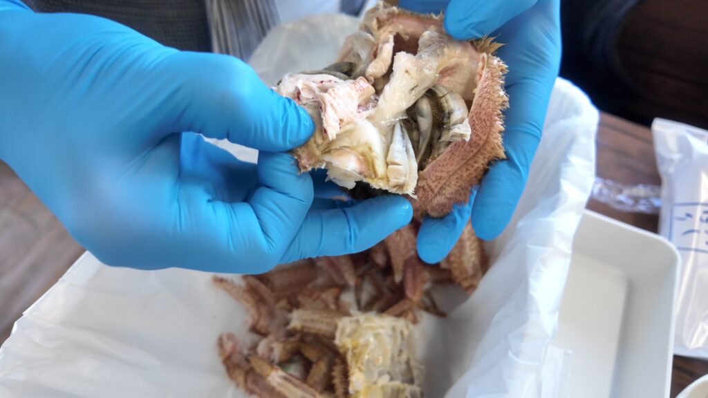 甲羅から外して、食べられない部分は落としていきます。