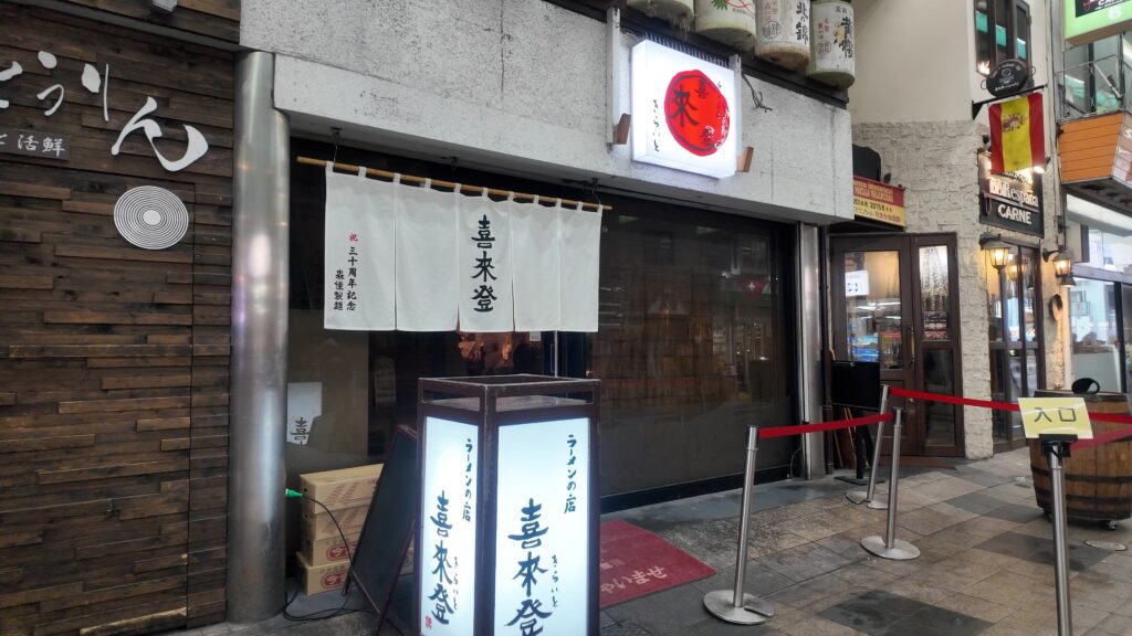 中央区にやってきたこの日、何を食べようかと狸小路を歩いていると、ちょうど列が短くなっていたので6丁目にあるラーメンのお店『喜来登』さんにお邪魔することに。