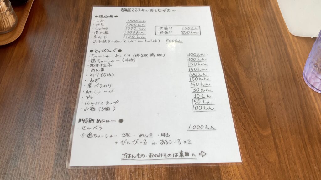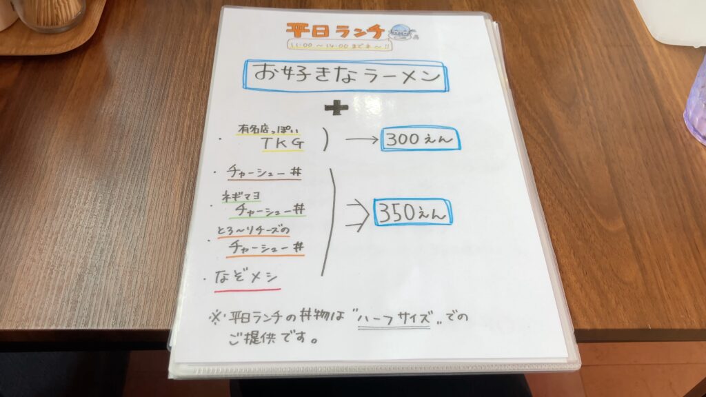 平日のランチタイムにはラーメンと組み合わせてハーフサイズのご飯物をお得にいただくこともできるようです。