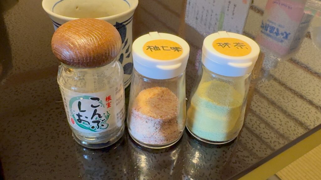 お塩はこんぶ、柚七味、抹茶の三種類。