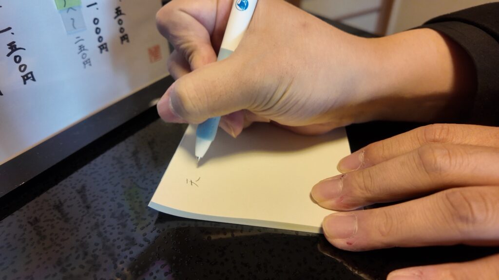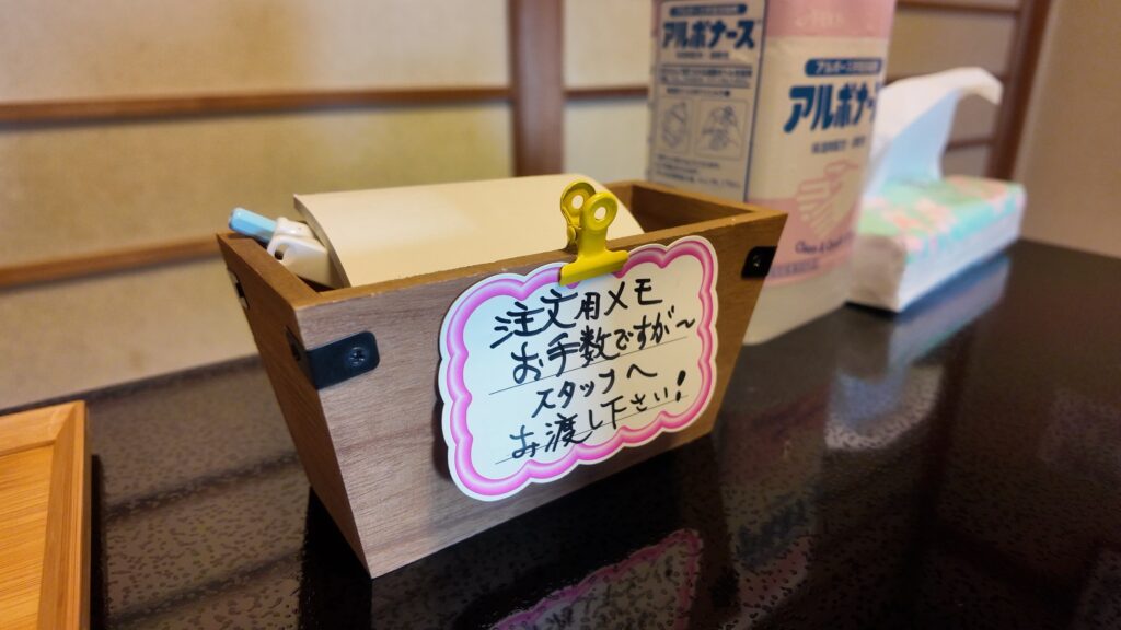 注文を決めたら、メニュー名を用紙に記入しお店の方へ渡します。