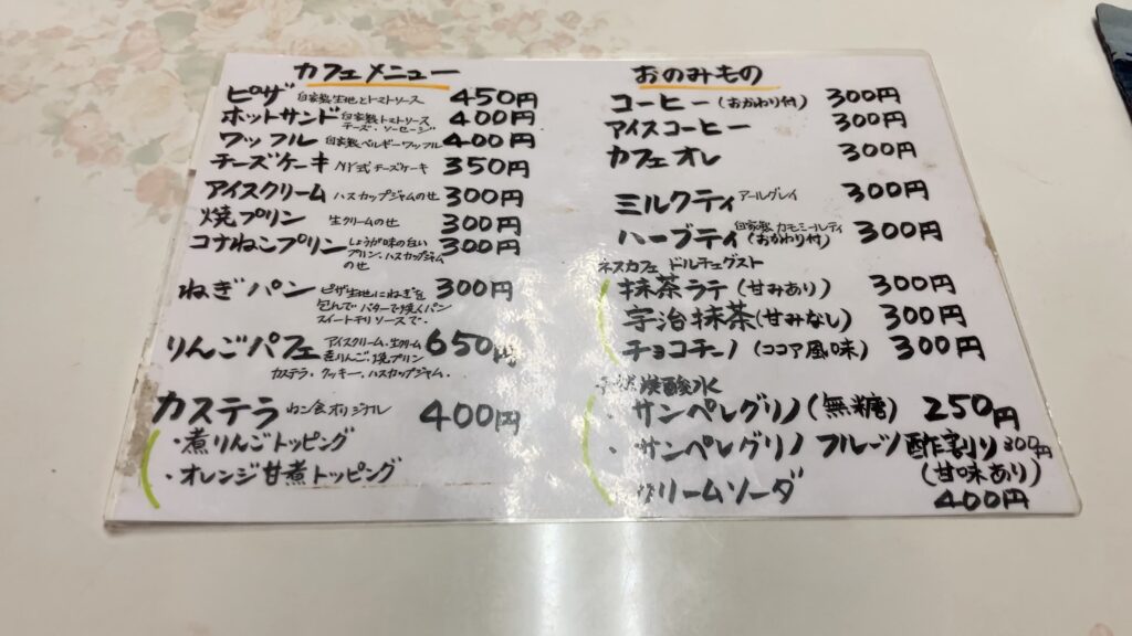 また、カフェメニューもあり、ピザやホットサンドなどの食事系からスイーツまで楽しむことができます。
