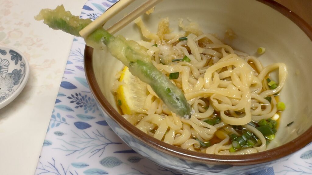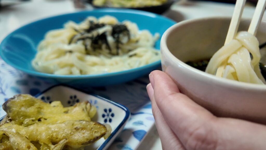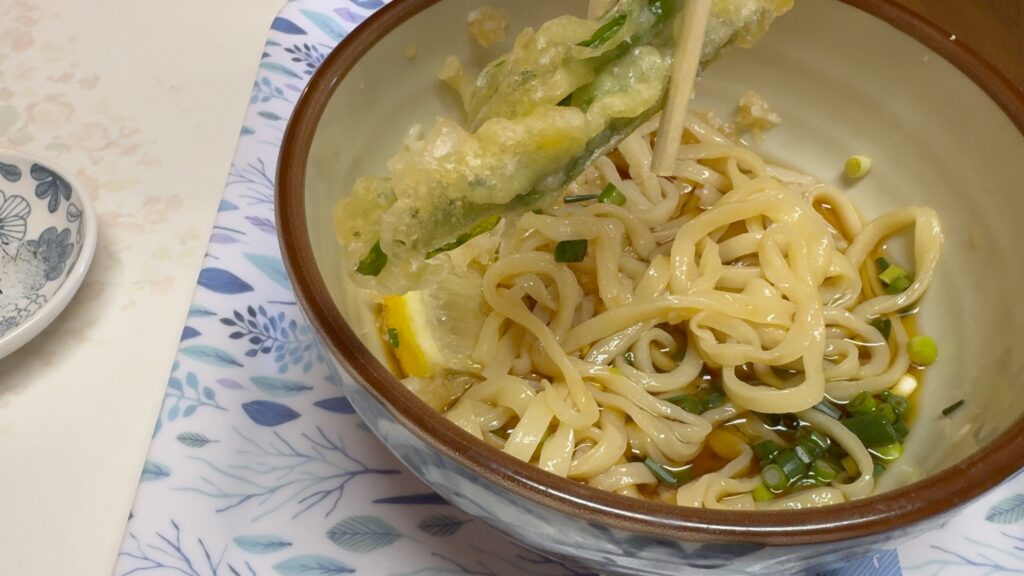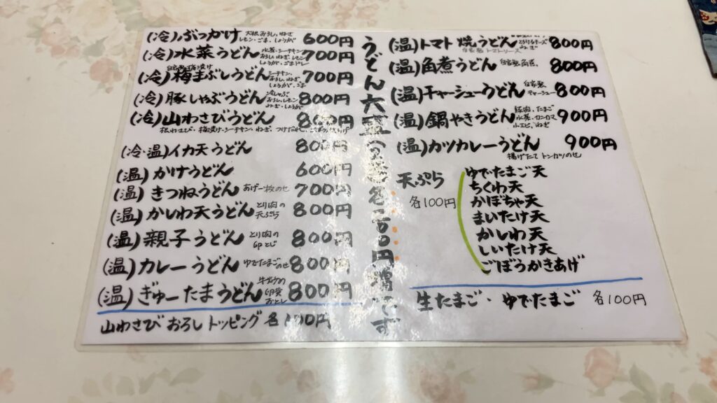うどんは冷たいのと温かいのがあり、種類が豊富。