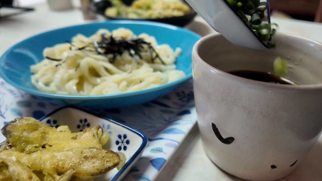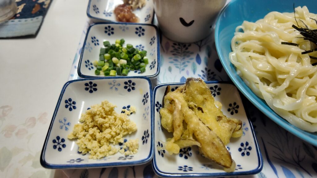 うどんにつけだれ、山わさびに梅漬け、シーチキン、ねぎ、ごぼうのかきあげも付いています。