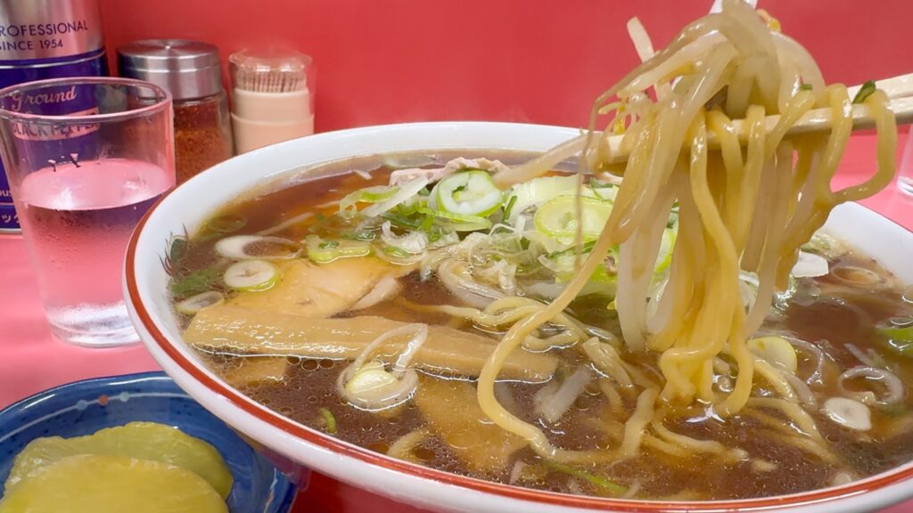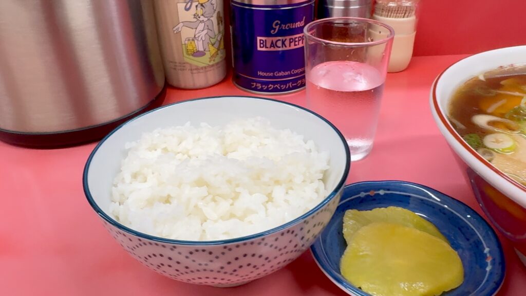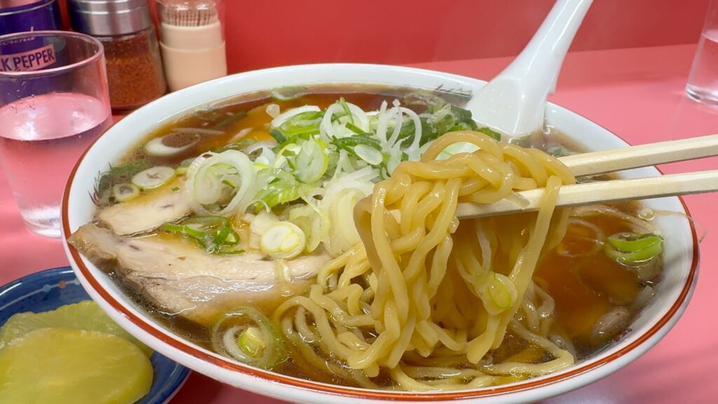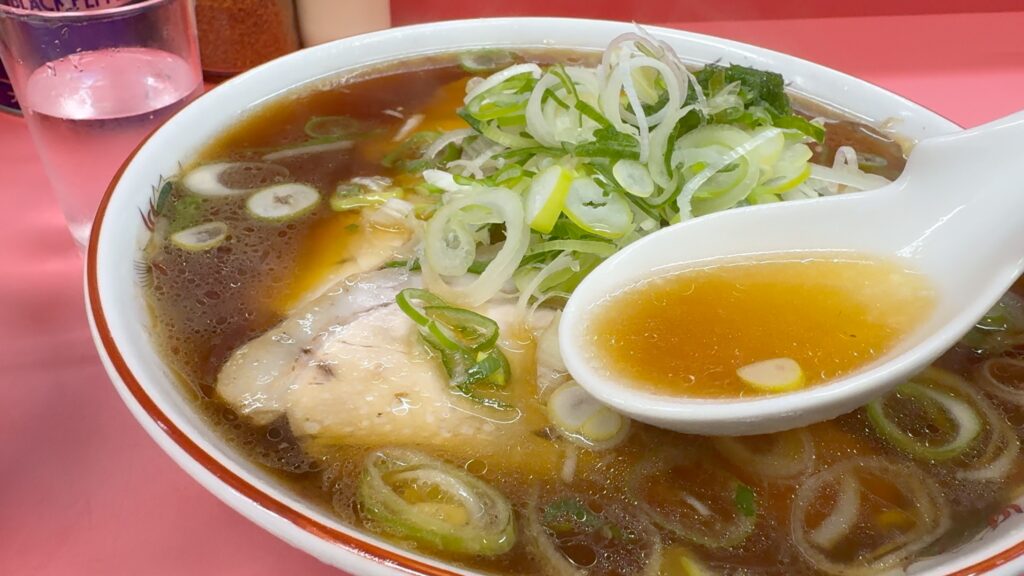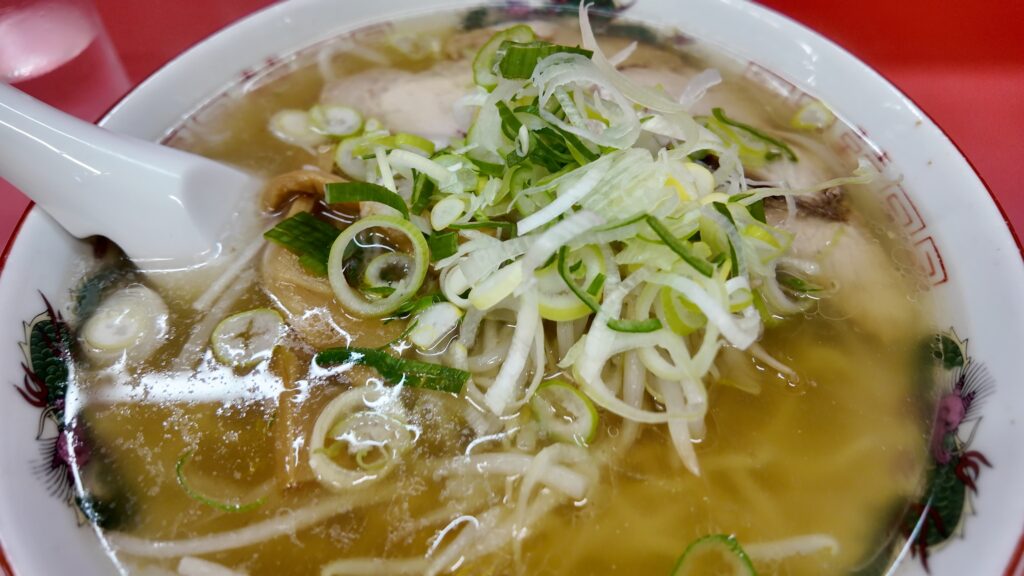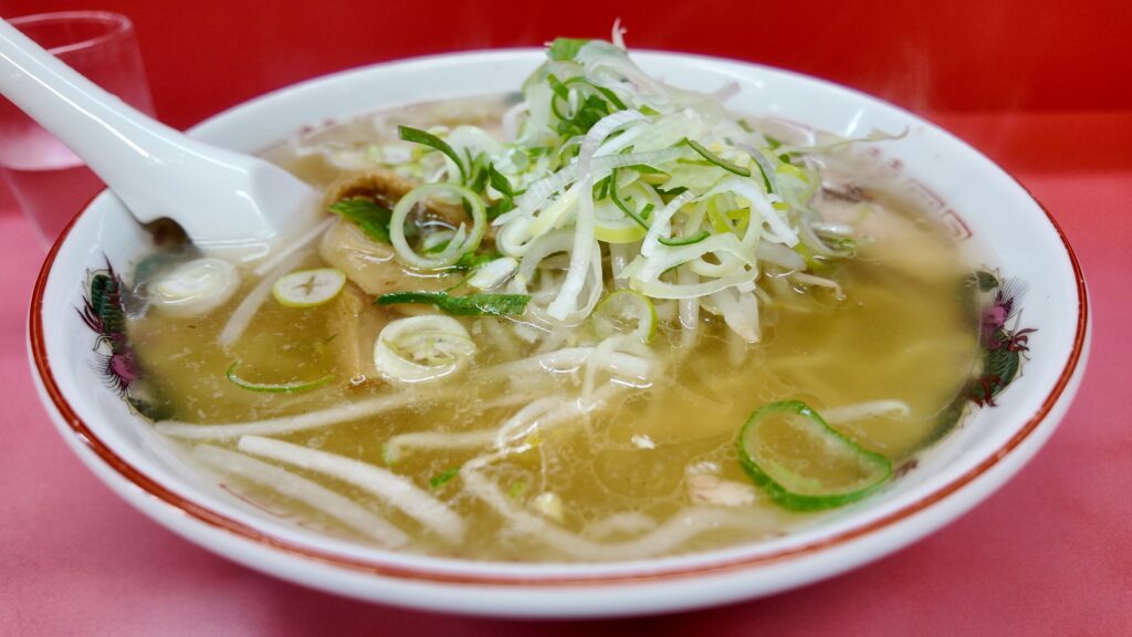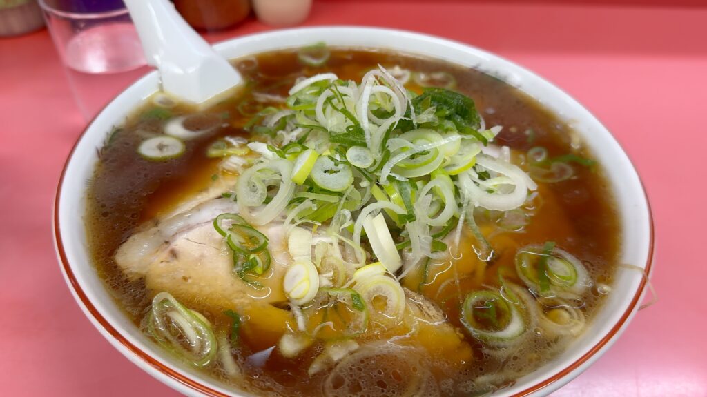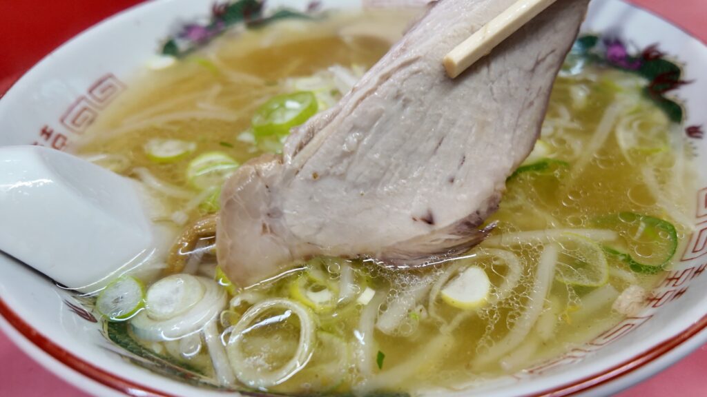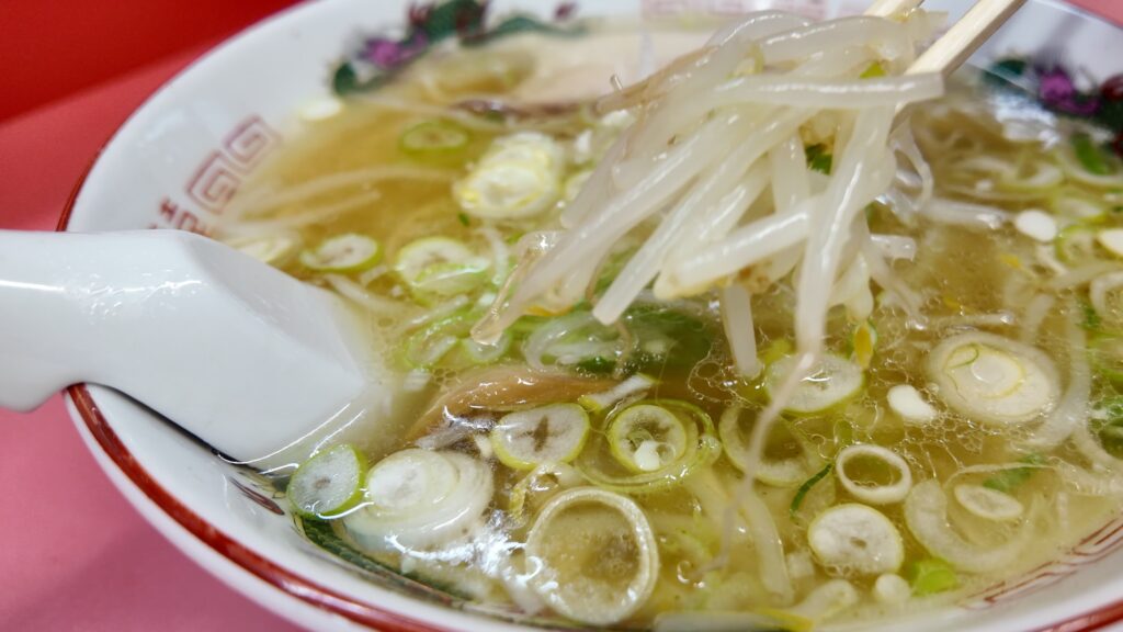 チャーシューは二枚入っていて、もやしもたっぷりでスープもなみなみなのでボリュームがあるように感じます。
