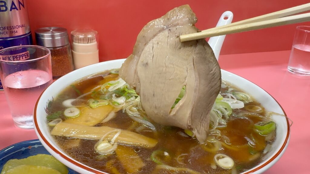チャーシューは一枚一枚が大きく、程よい肉肉しさで味付けが美味しいのでライスと食べたくなります。