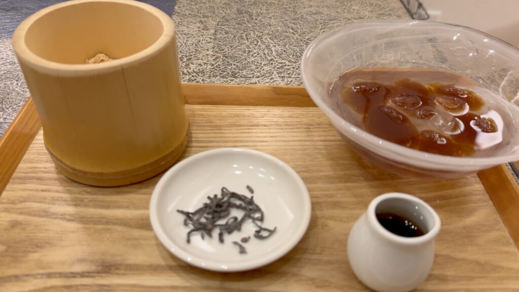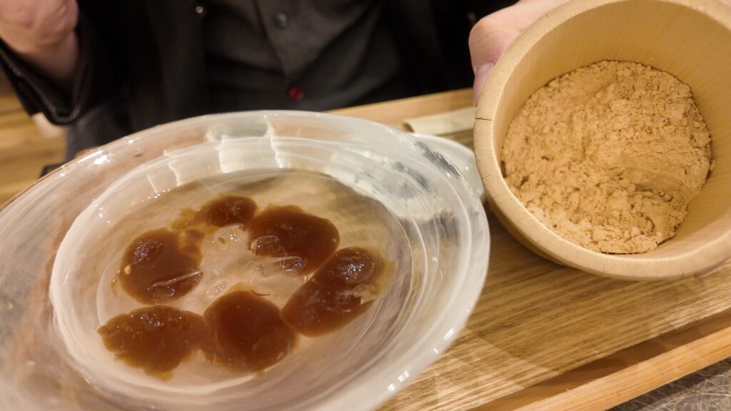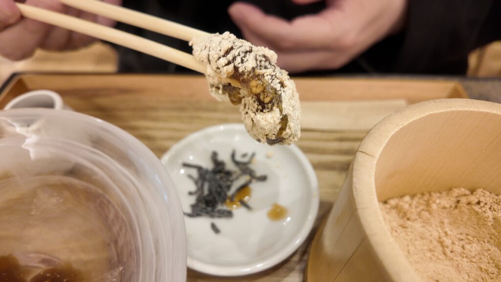 きなこを纏ったわらび餅を横の塩昆布のお皿にそっとお邪魔させていただきます。