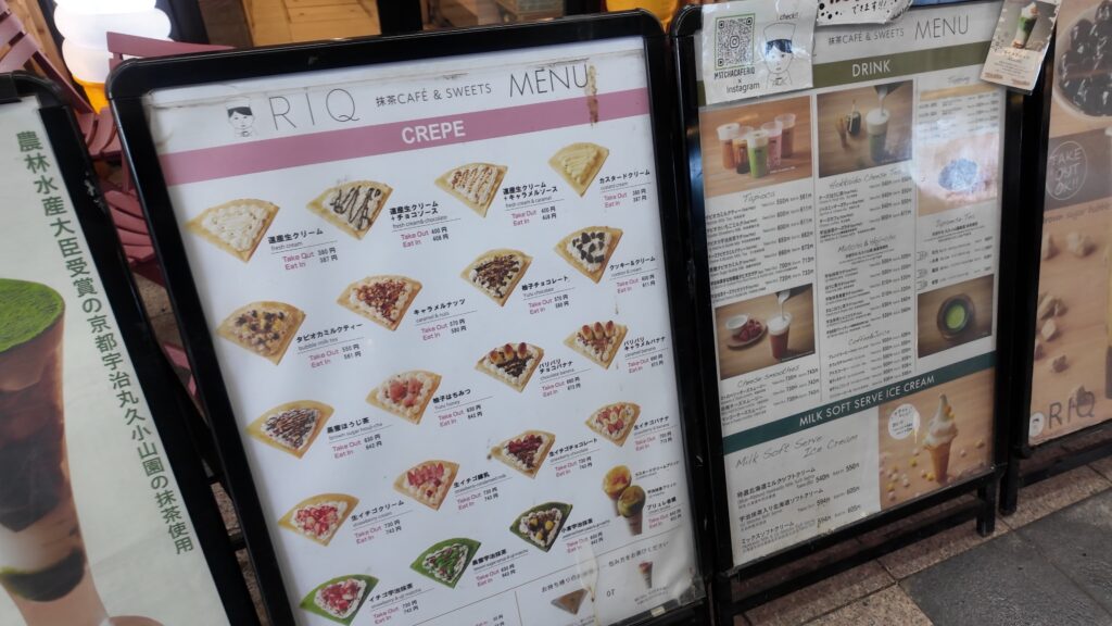 メニューはパフェやクレープ、ぜんざいやわらびもちなどもあり