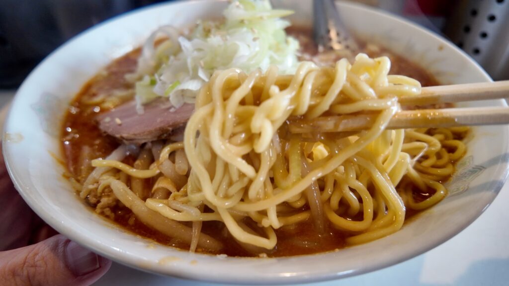 少し細めの麺がスープによく絡み、食べている最中にまた食べたくなる程のクセになる味わいです。
