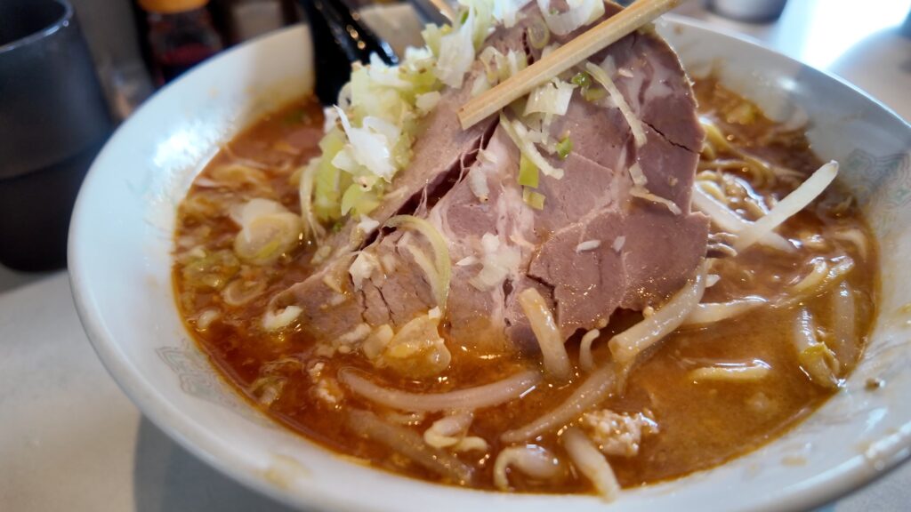 大きなチャーシューやネギの他に、シャキシャキのもやし、ひき肉も入っています。