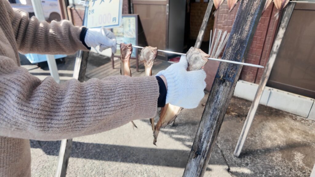 この日は伺った時間が時間が少し遅く、既に売り切れてしまいお魚が少ないそうでしたが軒先には干物が並べられています。