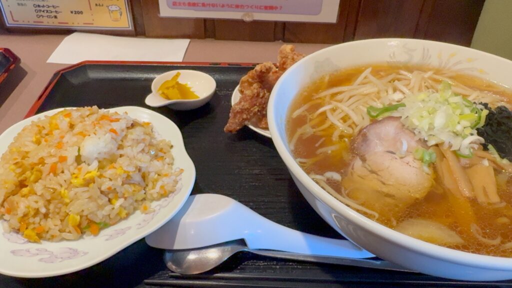 ミニ炒飯とラーメン、ミニからあげが2個付いたセットです。お漬物も付いていますね。