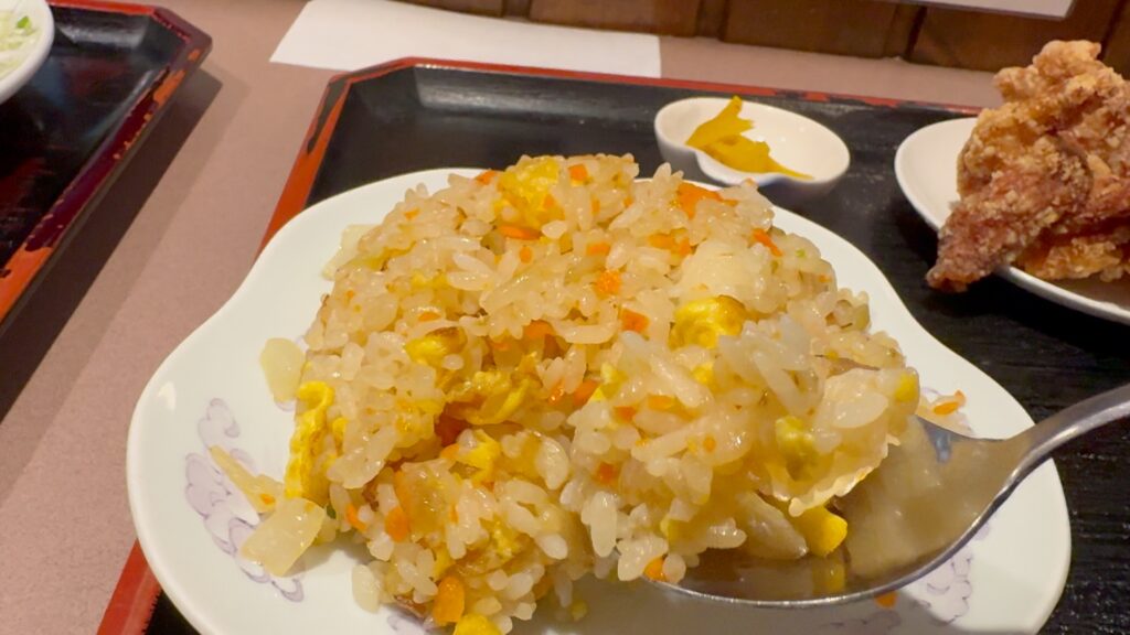炒飯はにんじん、玉ねぎ、卵が入っています。