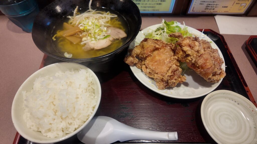 からあげ2個とミニラーメン、サラダとライスが付いた人気No2のセットです。