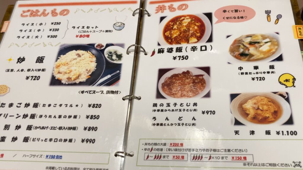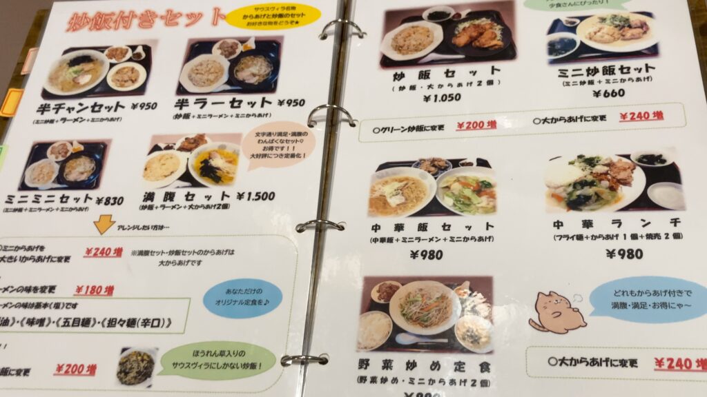 メニューは人気のからあげ定食をはじめ、ラーメンとのセットや炒飯に中華ランチ、つけ麺などもあり種類豊富。