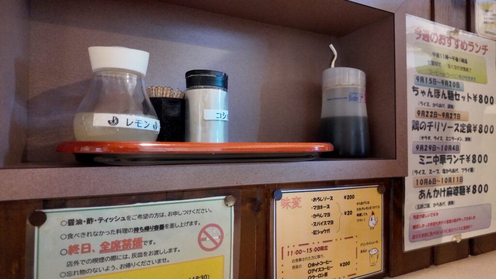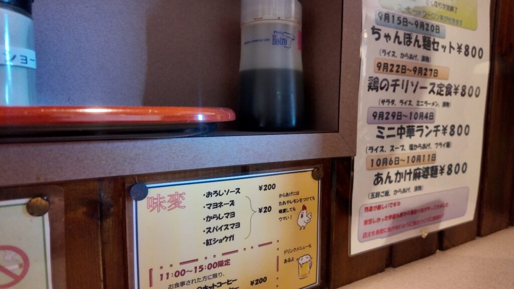 週替わりのおすすめランチやからあげの味変調味料もありました。