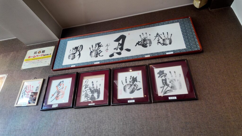 店主さんは元力士の方なのだそうで、店内には名だたる有名力士の方の手形が飾られていました。
