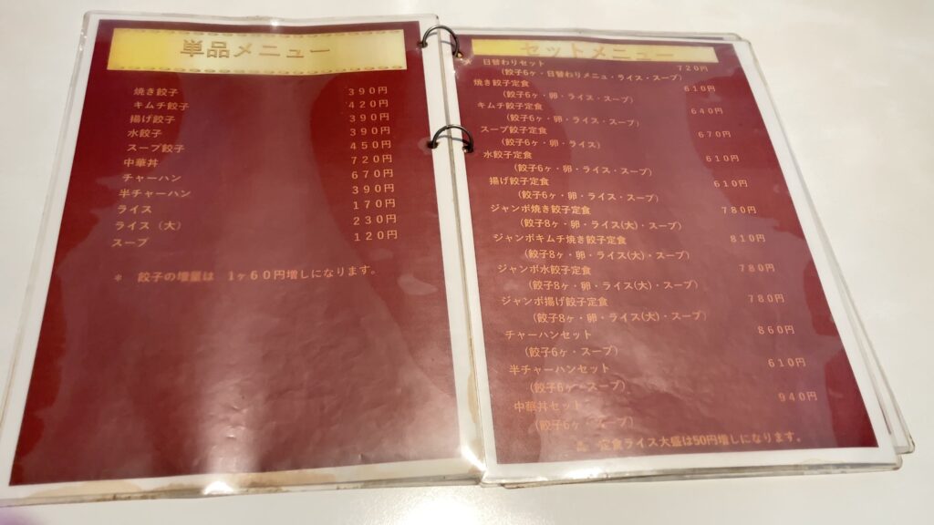 メニューは餃子各種の単品に餃子とのセットメニュー、ご飯ものにはチャーハンや中華丼もあります。