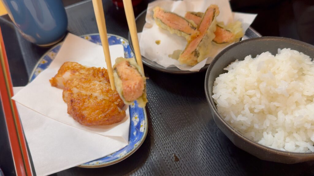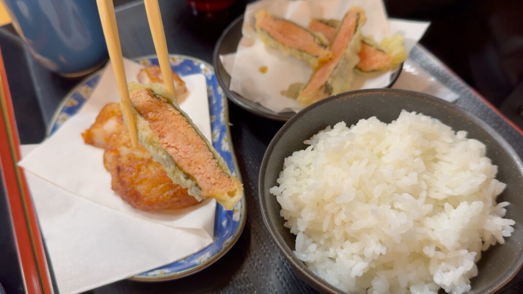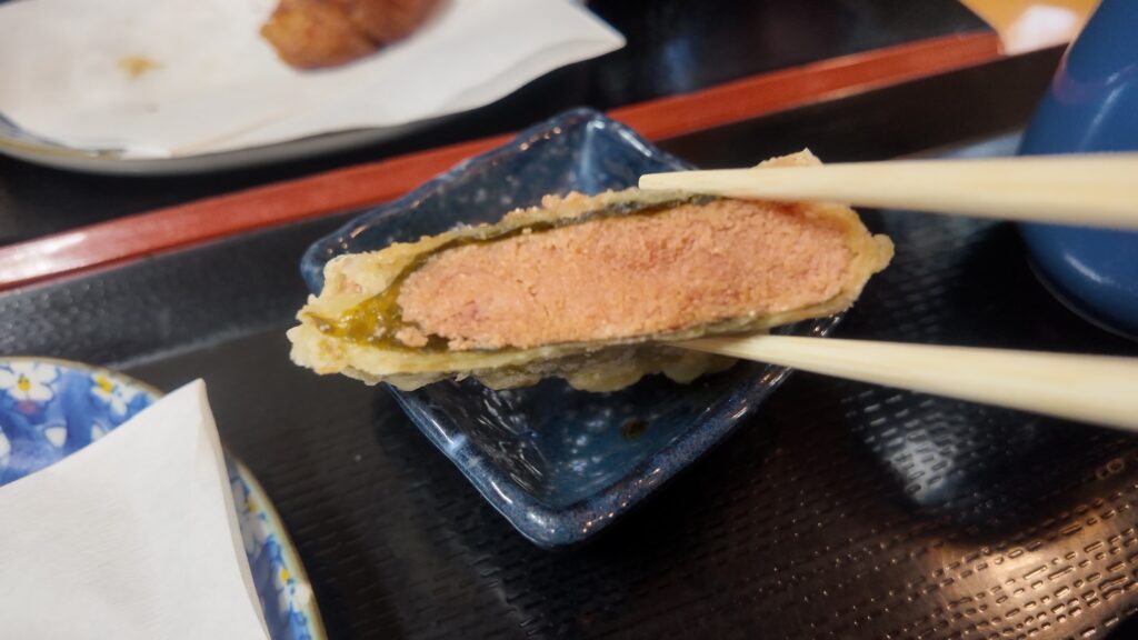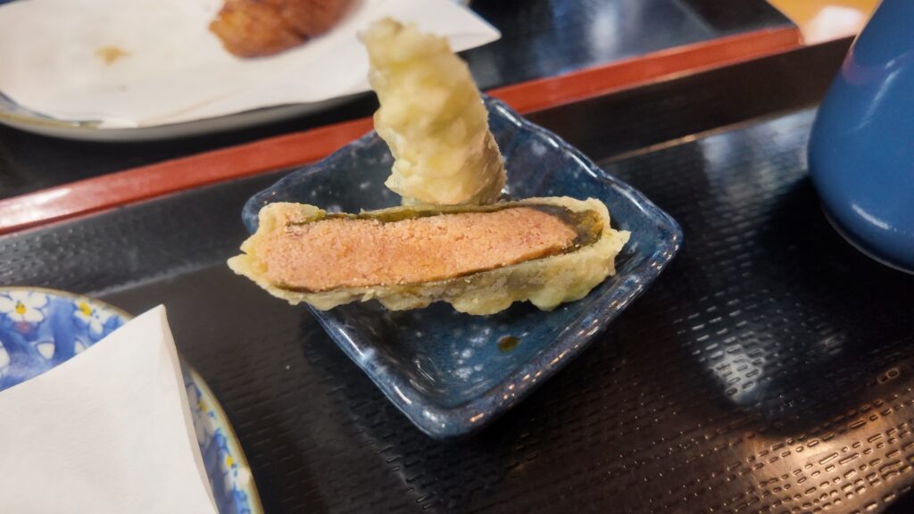 虎杖浜のたらこを海苔で巻いて天ぷらにされていて、衣はサクッと、たらこのプチッとした食感とちょうど良い塩っ気に海苔の風味が加わりとても美味しいです。