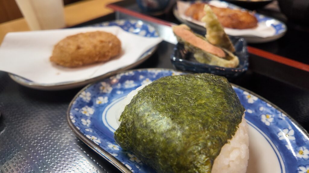 私も単品を組み合わせて『たらこおにぎり』『たらこ天』『白老牛コロッケ』を注文。