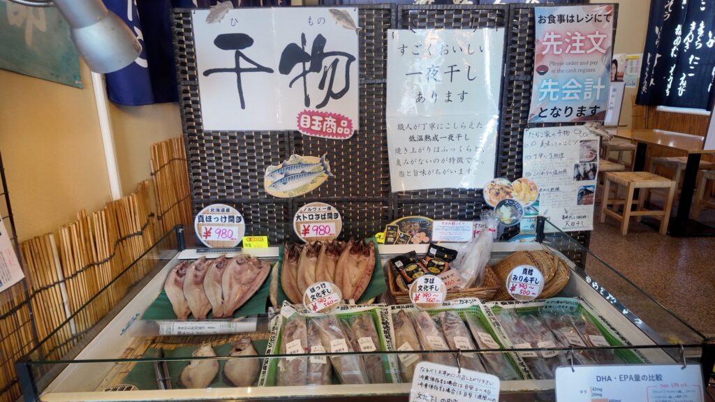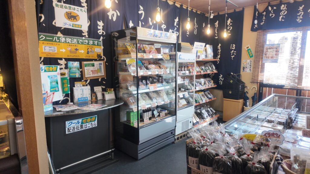 店内では地元で水揚げされた魚介類や水産加工品の販売がされています。